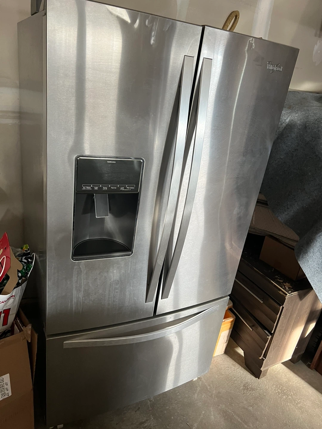 Whirlpool French door refrigerator in stainless steel. It has a water and ice dispenser on the exterior. The interior features adjustable glass shelves and multiple crisper drawers. The bottom freezer drawer offers ample storage space.