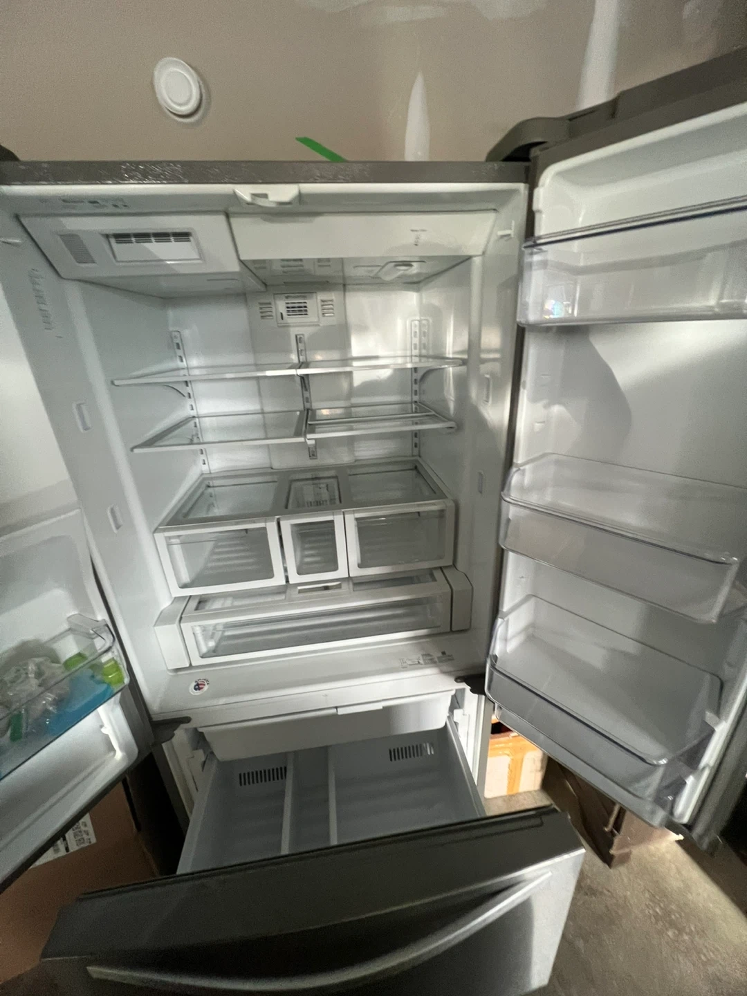Whirlpool French door refrigerator in stainless steel. It has a water and ice dispenser on the exterior. The interior features adjustable glass shelves and multiple crisper drawers. The bottom freezer drawer offers ample storage space.