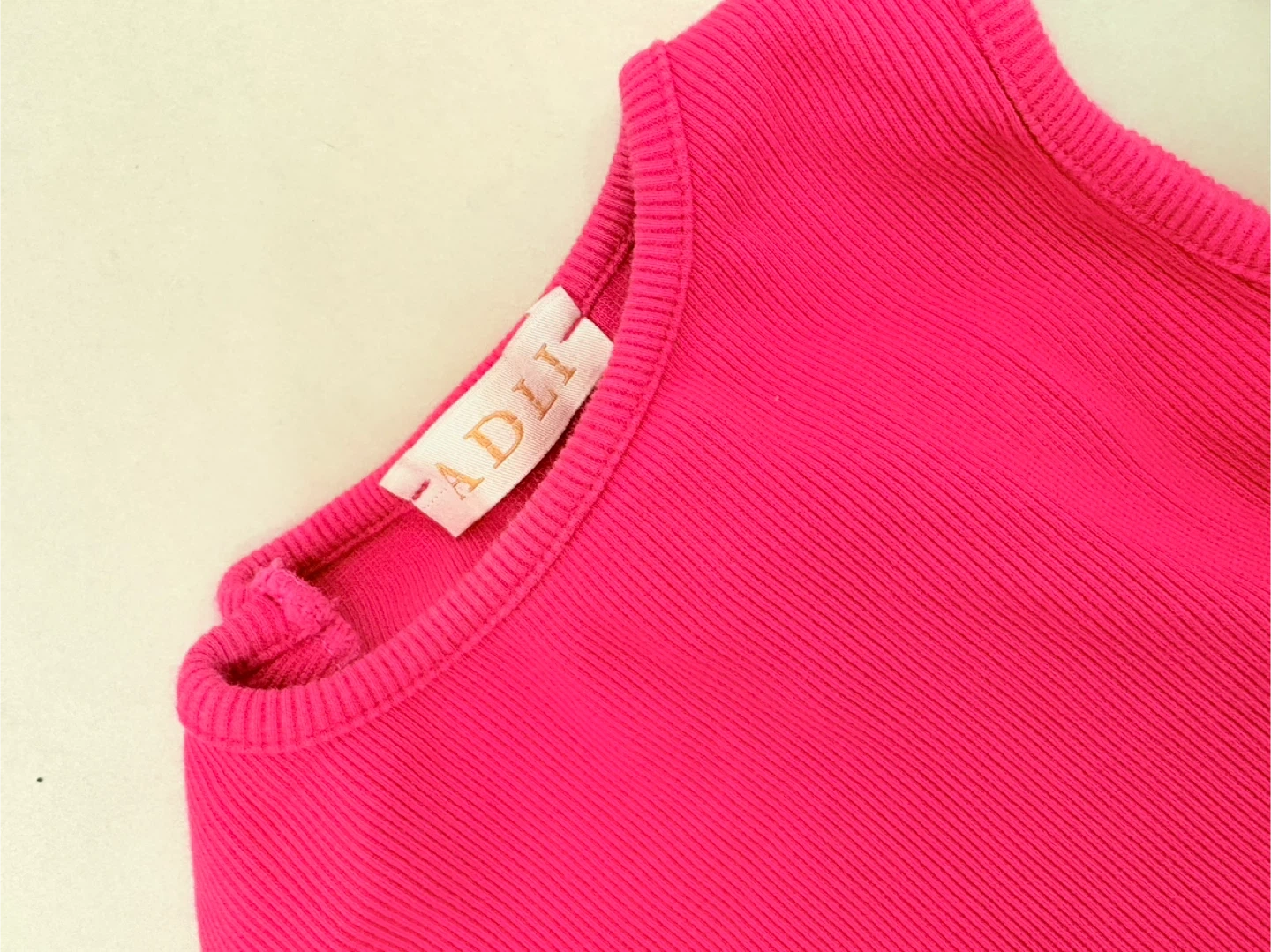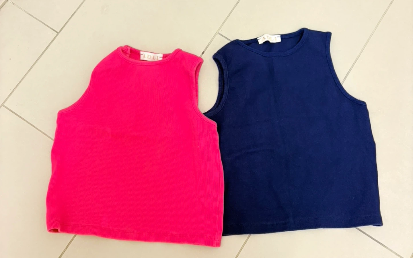 Set of two Adli brand tank tops for kids. One is a bright pink ribbed knit, and the other is a solid navy blue. They're great for layering or warm weather. Both appear to be cotton blend.