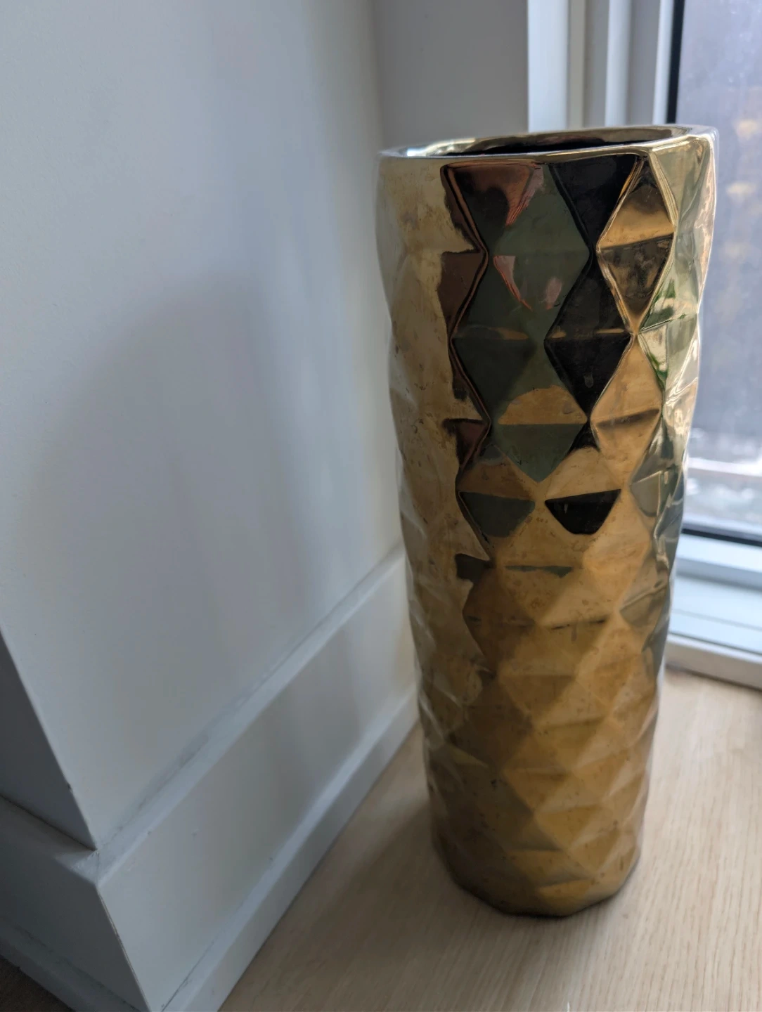 Tall, gold-coloured ceramic vase with a textured geometric pattern. It's a striking piece for any room. This vase can hold fresh or artificial flowers.