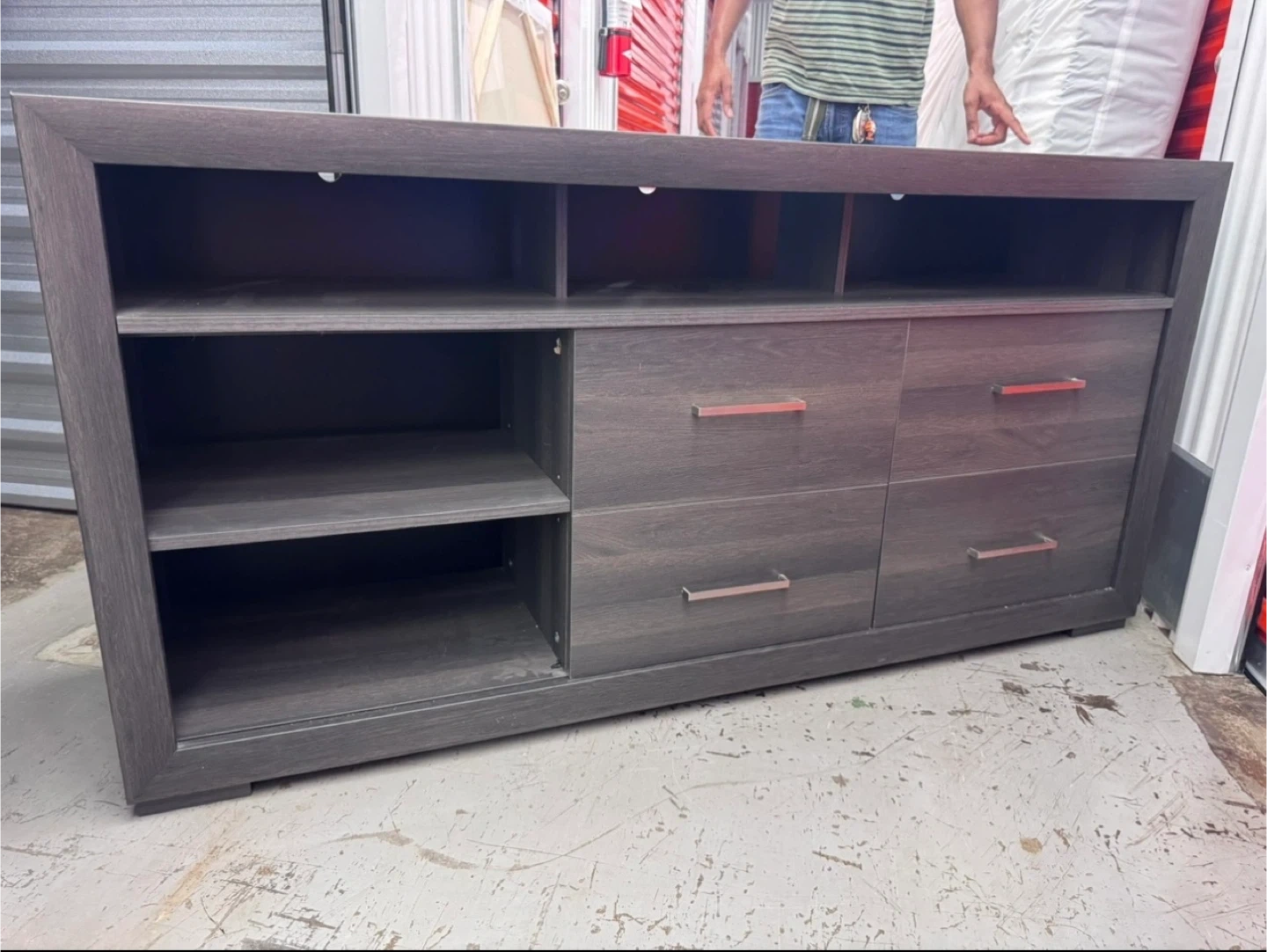• Open shelving for media devices (cable box, consoles, décor)