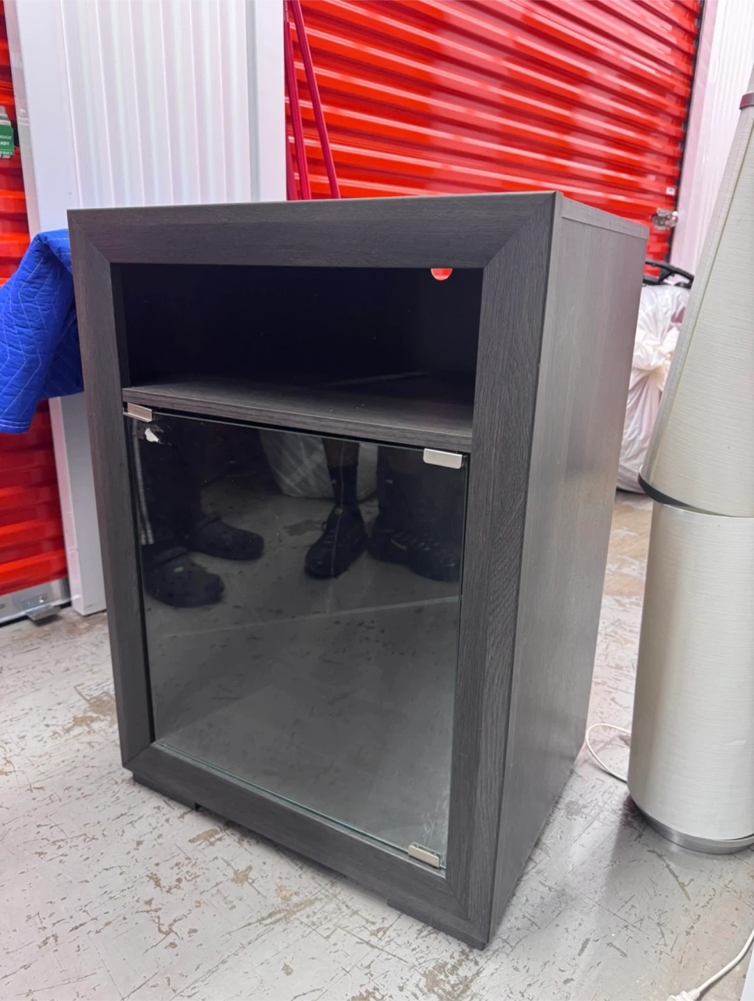 • Glass front door (great for displaying items or storing electronics)