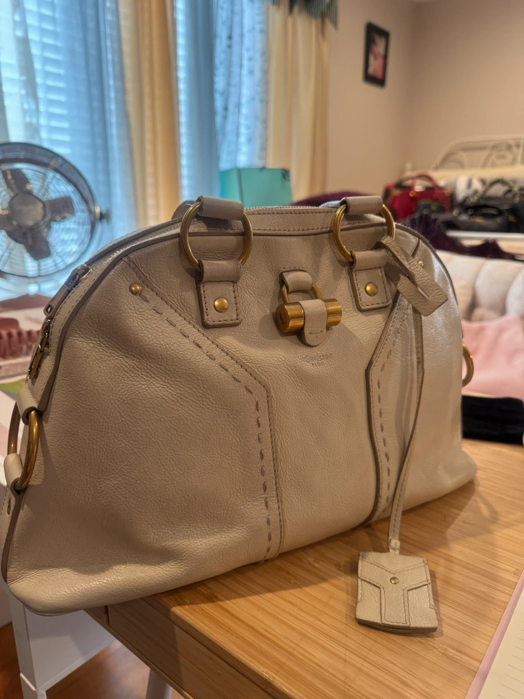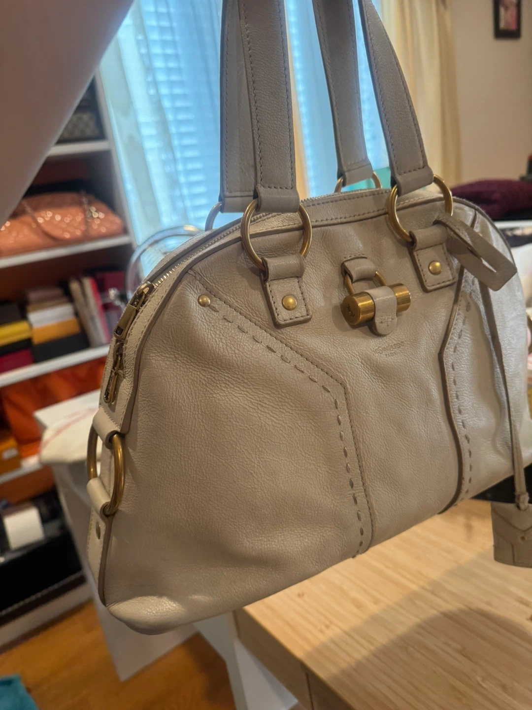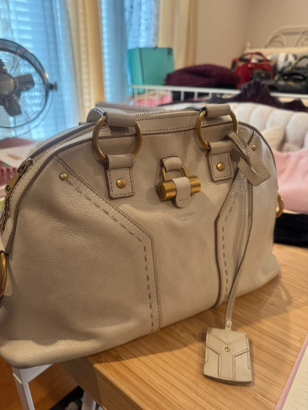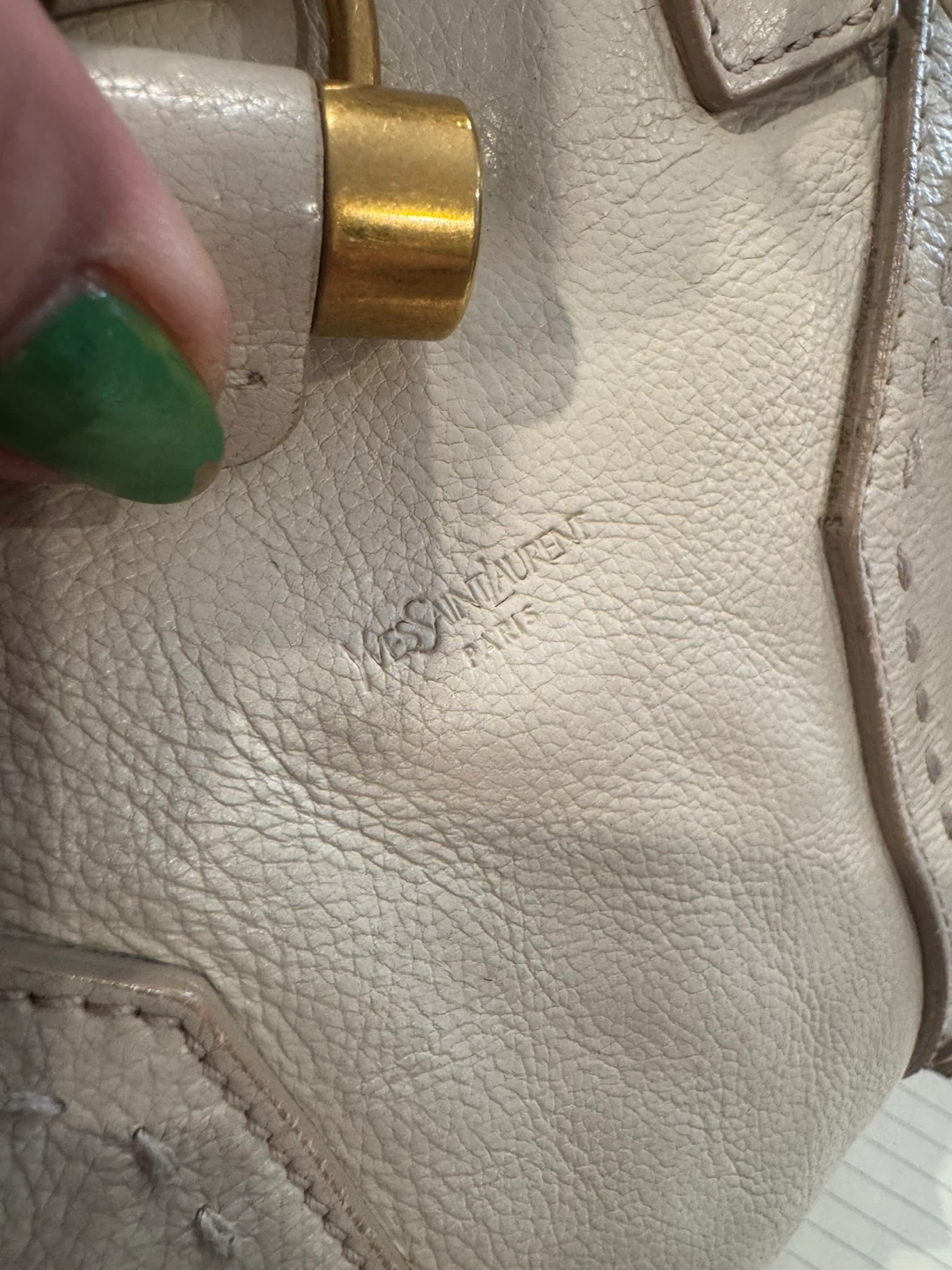Pre-loved Yves Saint Laurent Muse Two handbag. Cream coloured leather with gold hardware. A classic designer piece for everyday use.