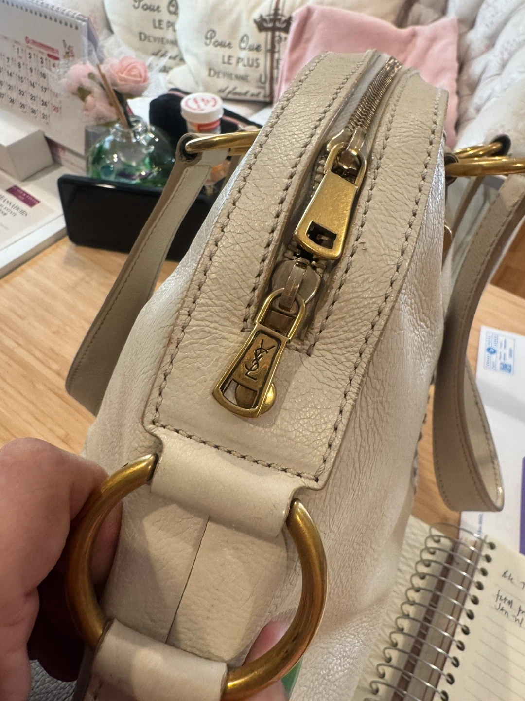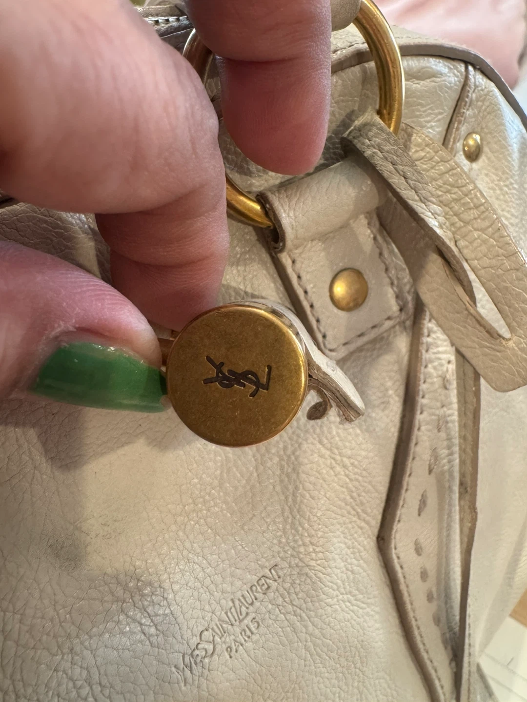 Pre-loved Yves Saint Laurent Muse Two handbag. Cream coloured leather with gold hardware. A classic designer piece for everyday use.