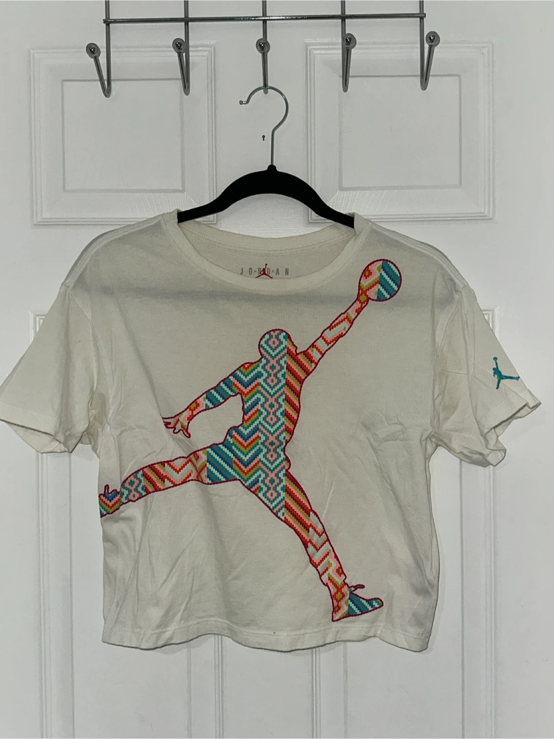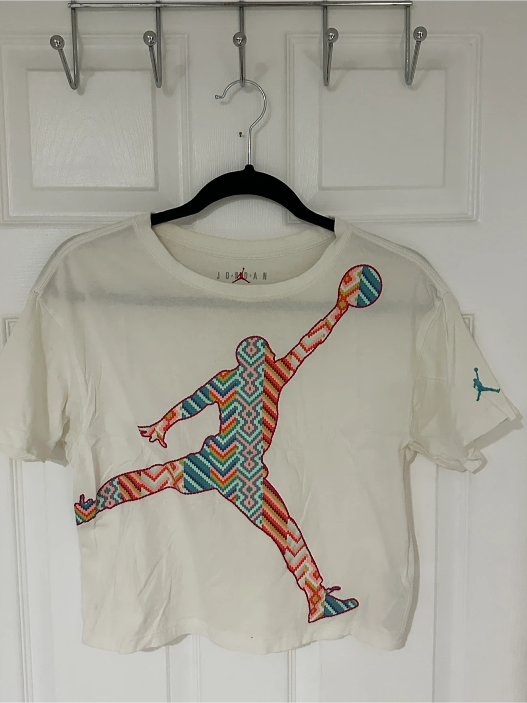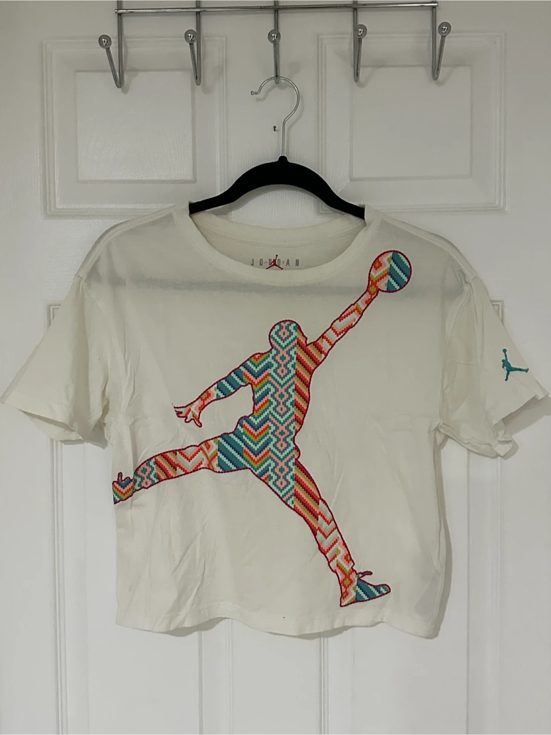 This cream-coloured Jordan t-shirt features the iconic Jumpman logo filled with a colourful, geometric pattern. It's a cropped style t-shirt. Made from soft cotton material. Youth large