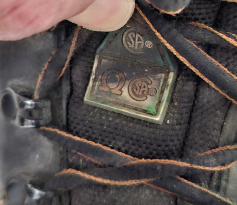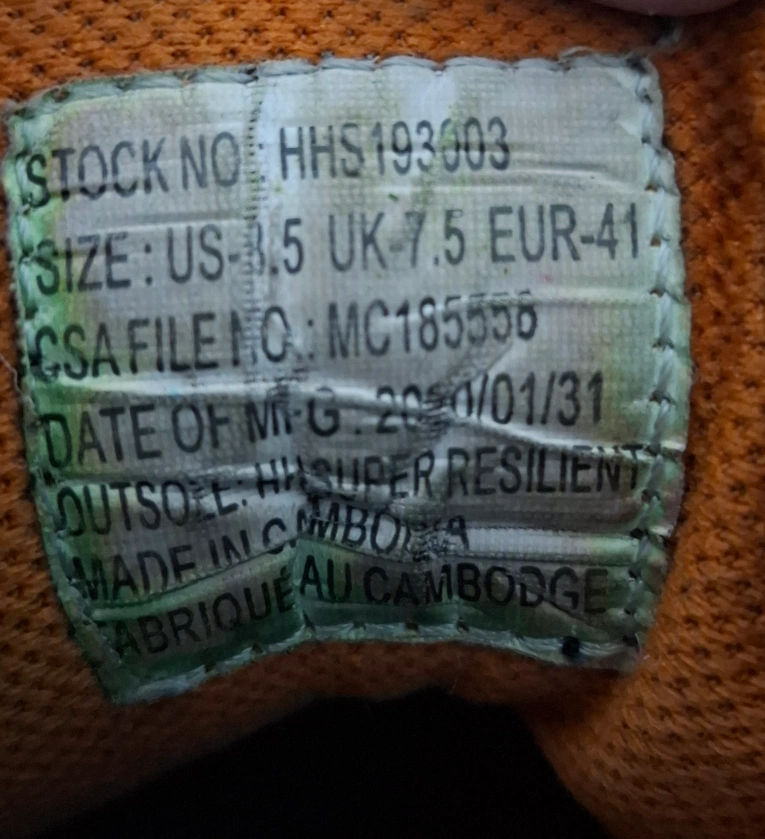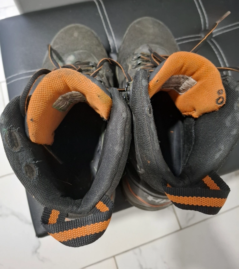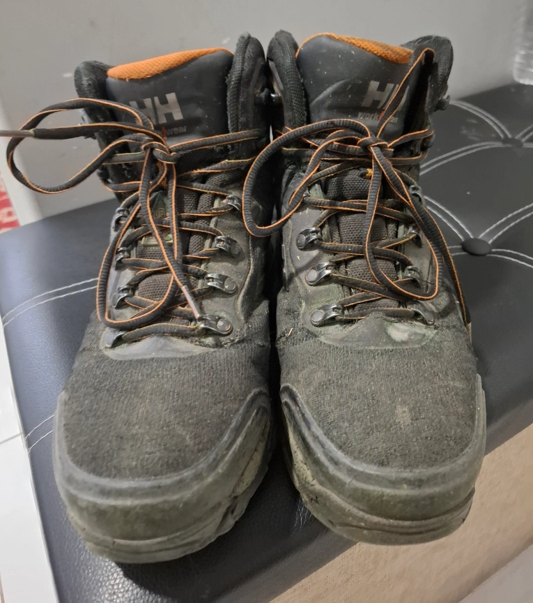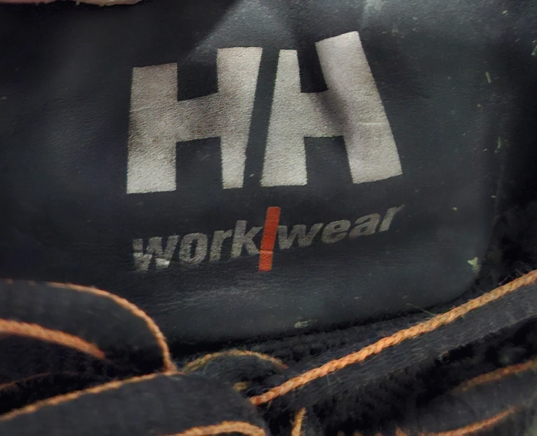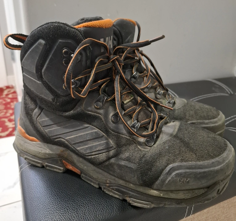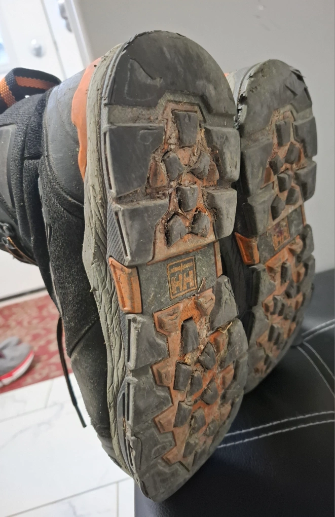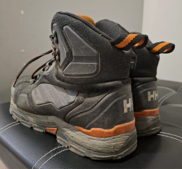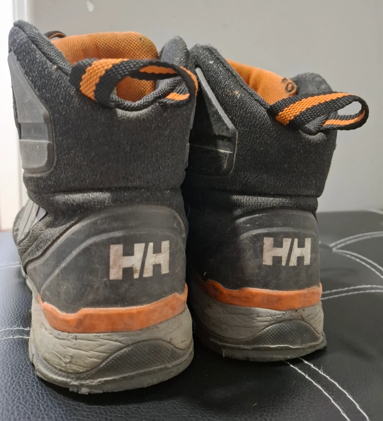 Used Helly Hansen hiking boots. Black with orange accents. Lace-up closure. Show some wear from use. Good for outdoor activities. SAFETY SHOES. STEEL TOE.