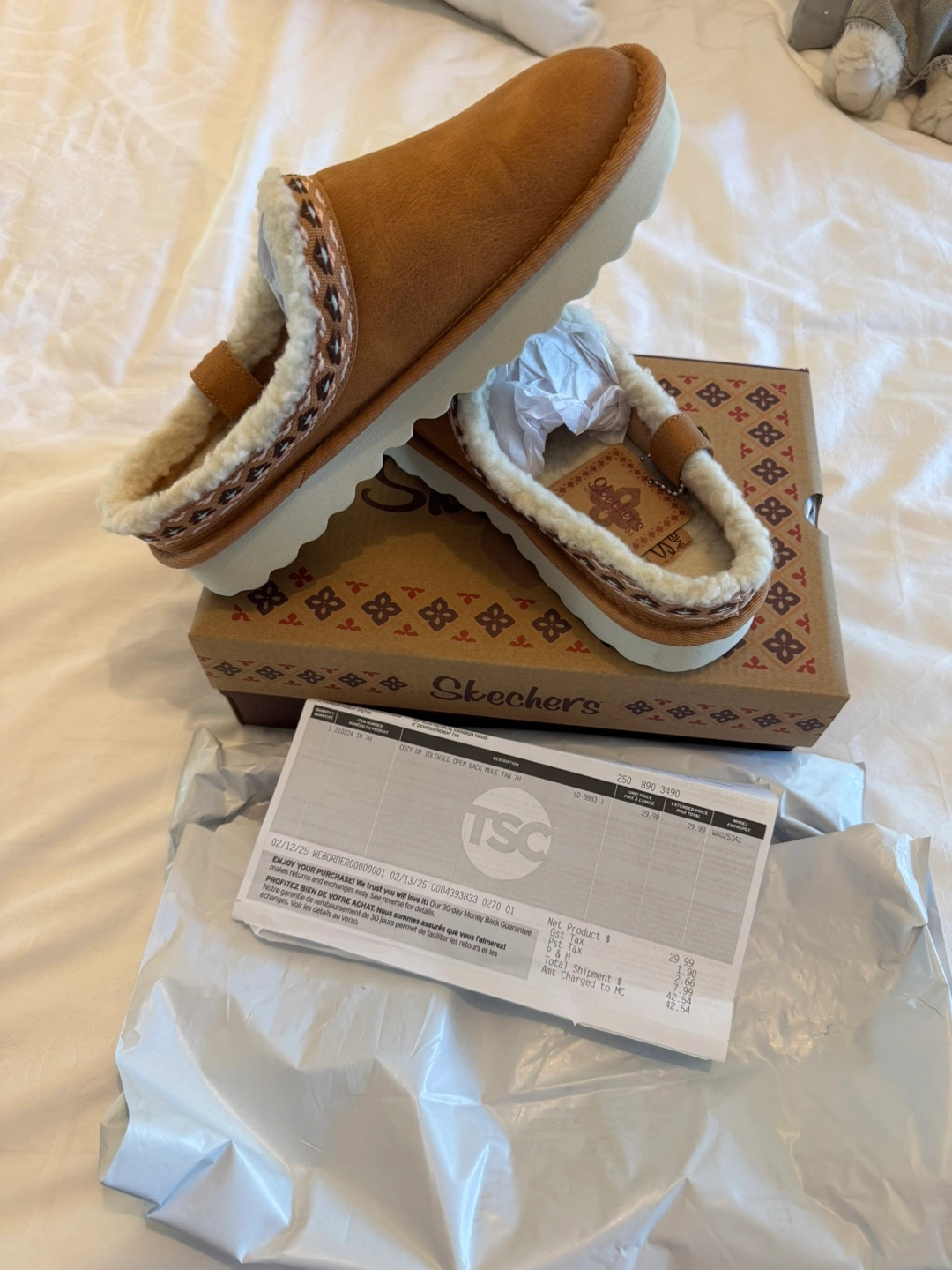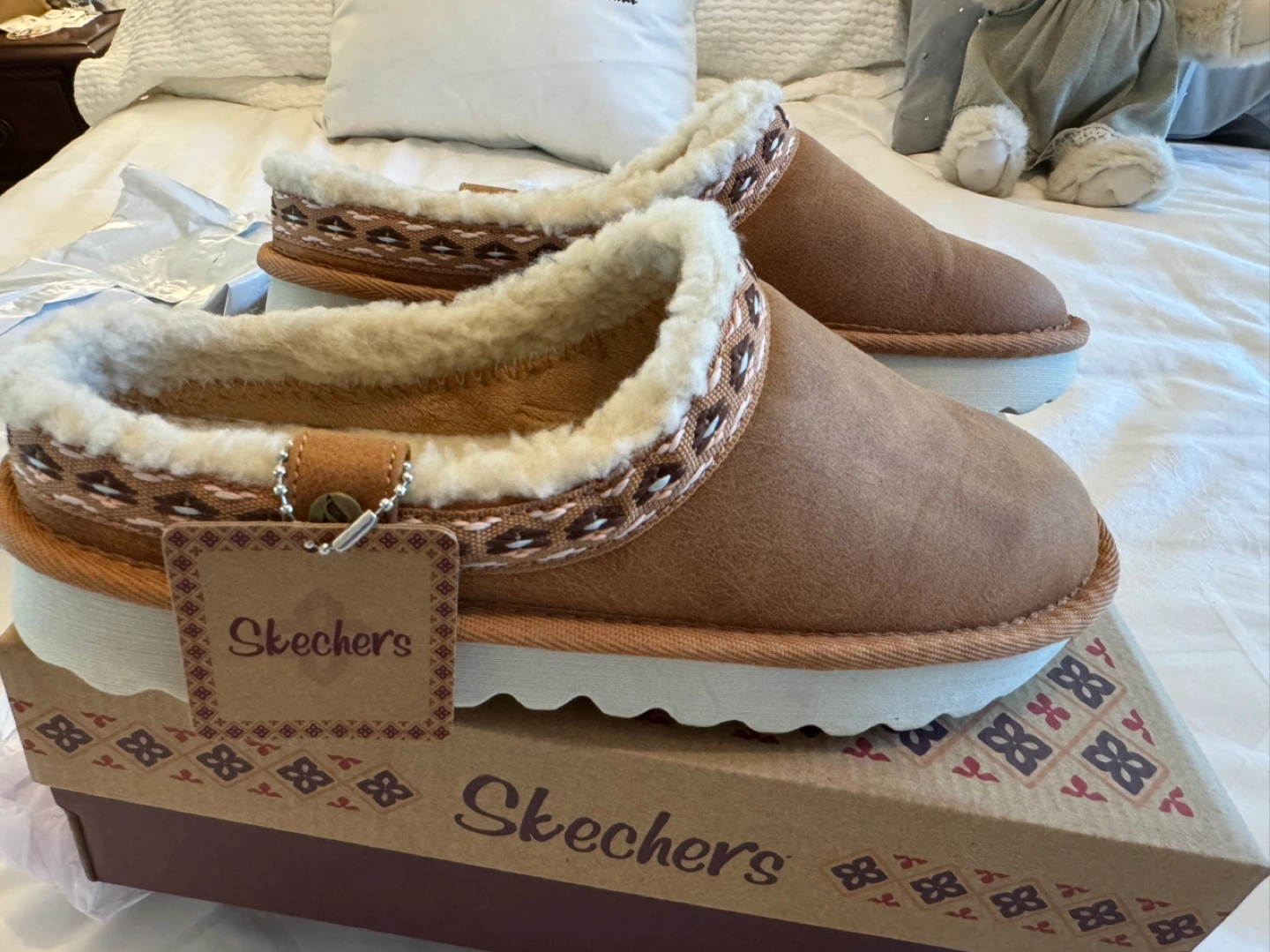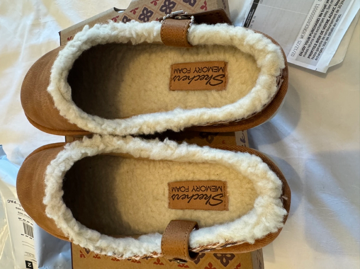 Brand new women's Skechers clogs. Tan suede upper, shearling lining. Memory foam insole. Cozy and comfortable. Size 7 H . Pick up in Comox fcfs