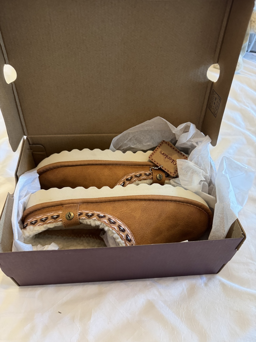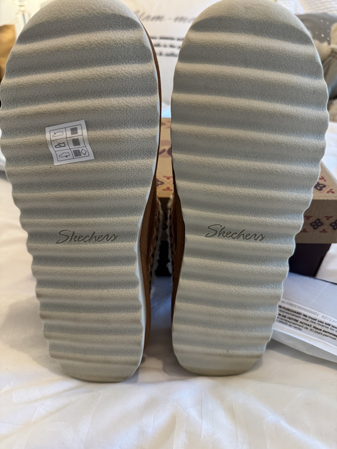 Brand new women's Skechers clogs. Tan suede upper, shearling lining. Memory foam insole. Cozy and comfortable. Size 7 H . Pick up in Comox fcfs