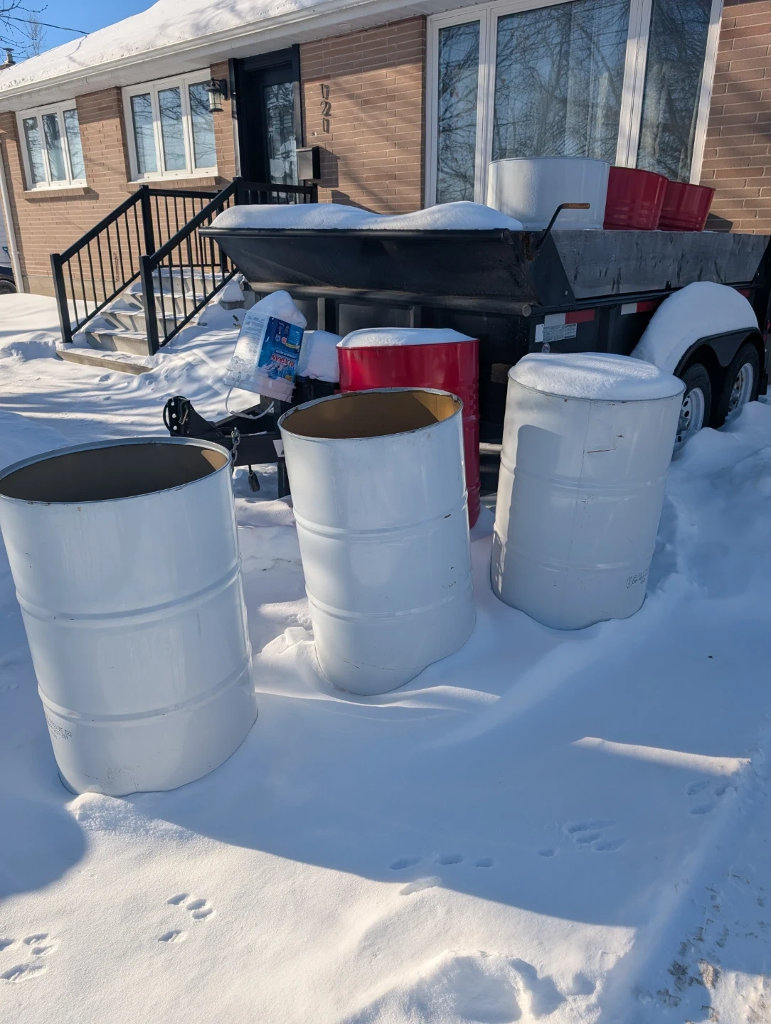 Selling a few metal barrels, some white and some red. These are great for storage or other projects. They're made of durable metal. Available for pickup.