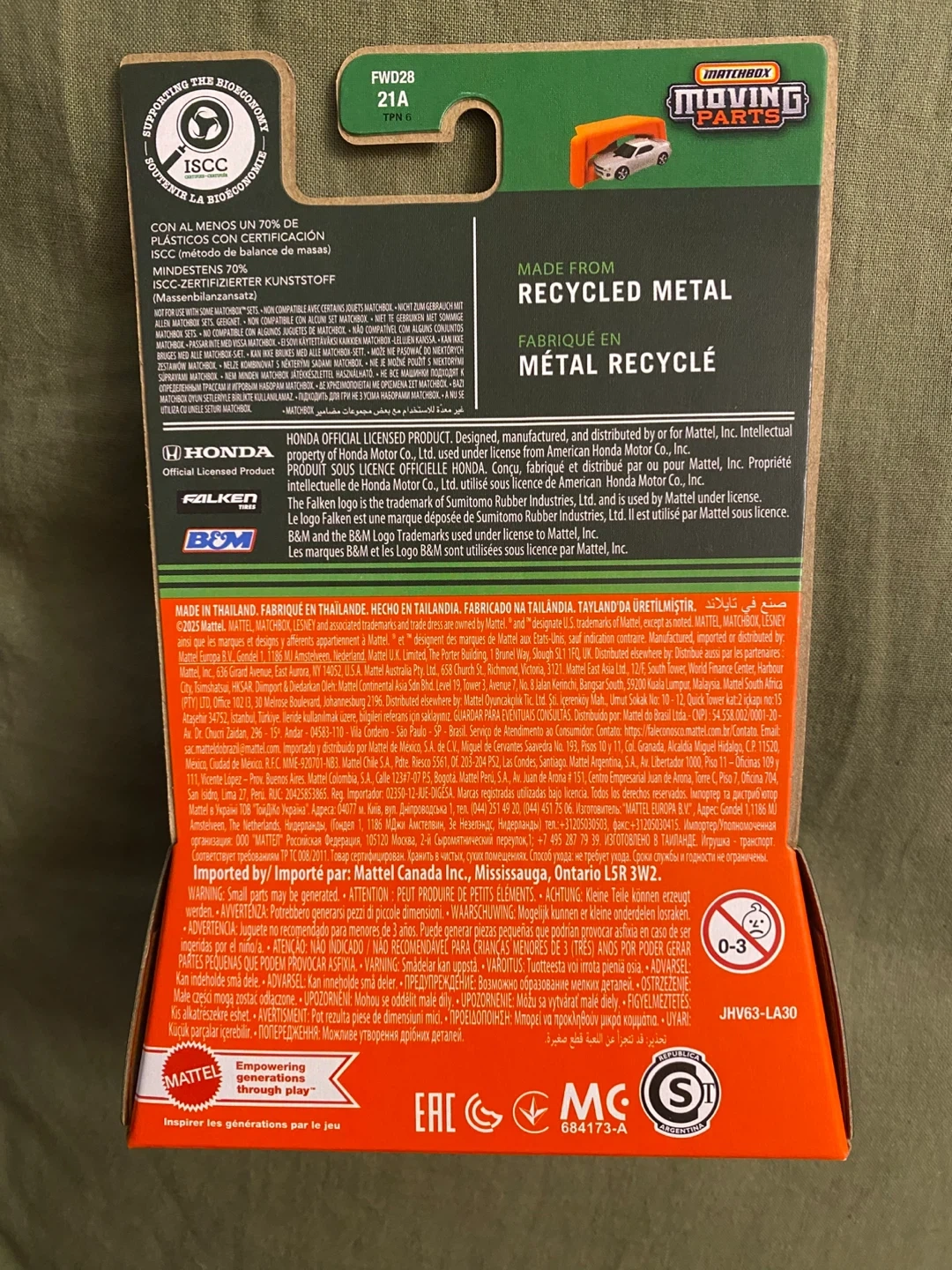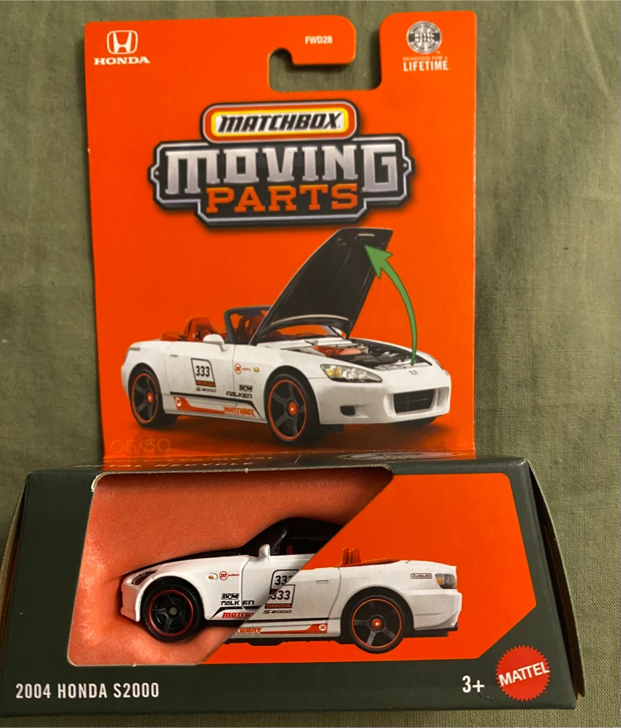 White 2004 Honda S2000 Matchbox Moving Parts diecast car. Made from a minimum of 70% ISCC-certified plastic. It's a detailed collectible model.