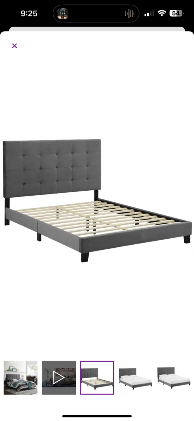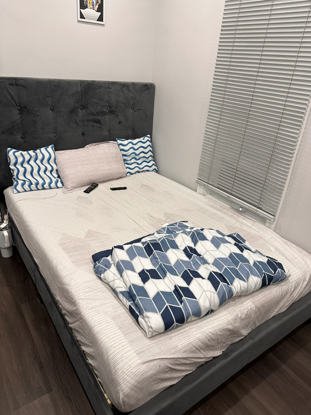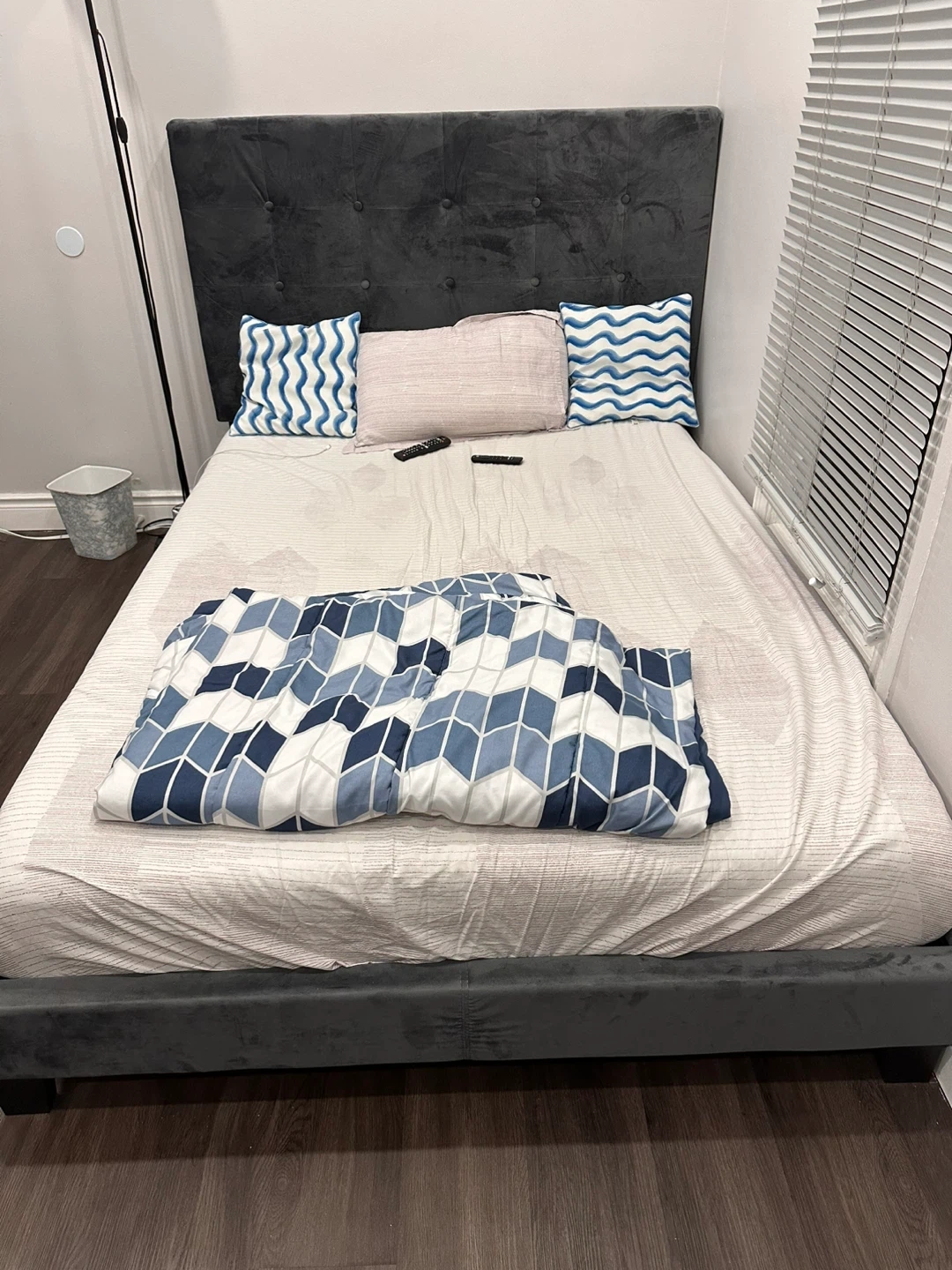 Selling my like new grey upholstered platform double bed frame with Memory Foam Mattress. It's in great condition and ready for a new home! It has a modern look.