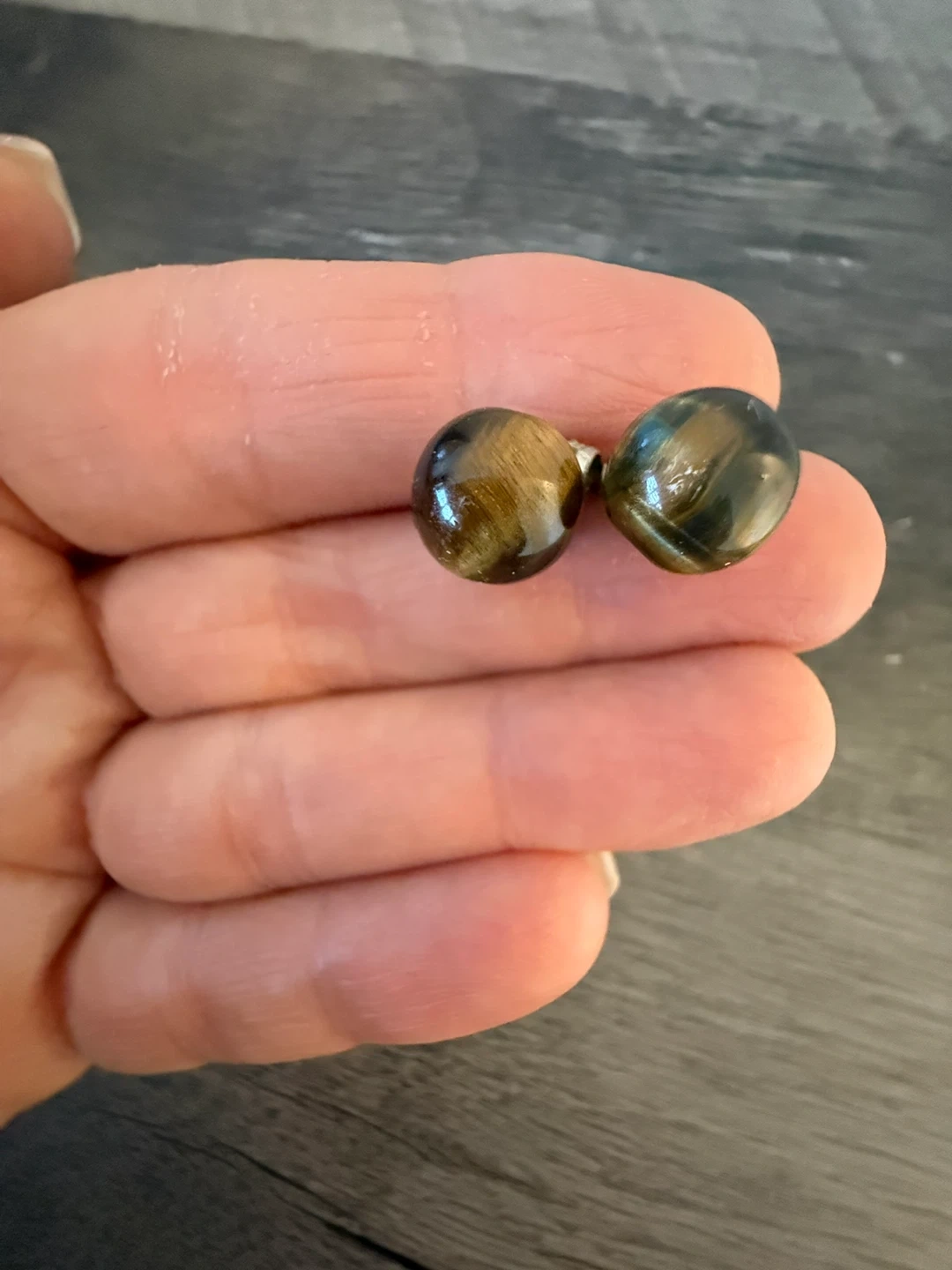 A pair of round tiger's eye stud earrings. These earrings feature natural gemstone beads with a polished finish. The metal posts are silver-toned.