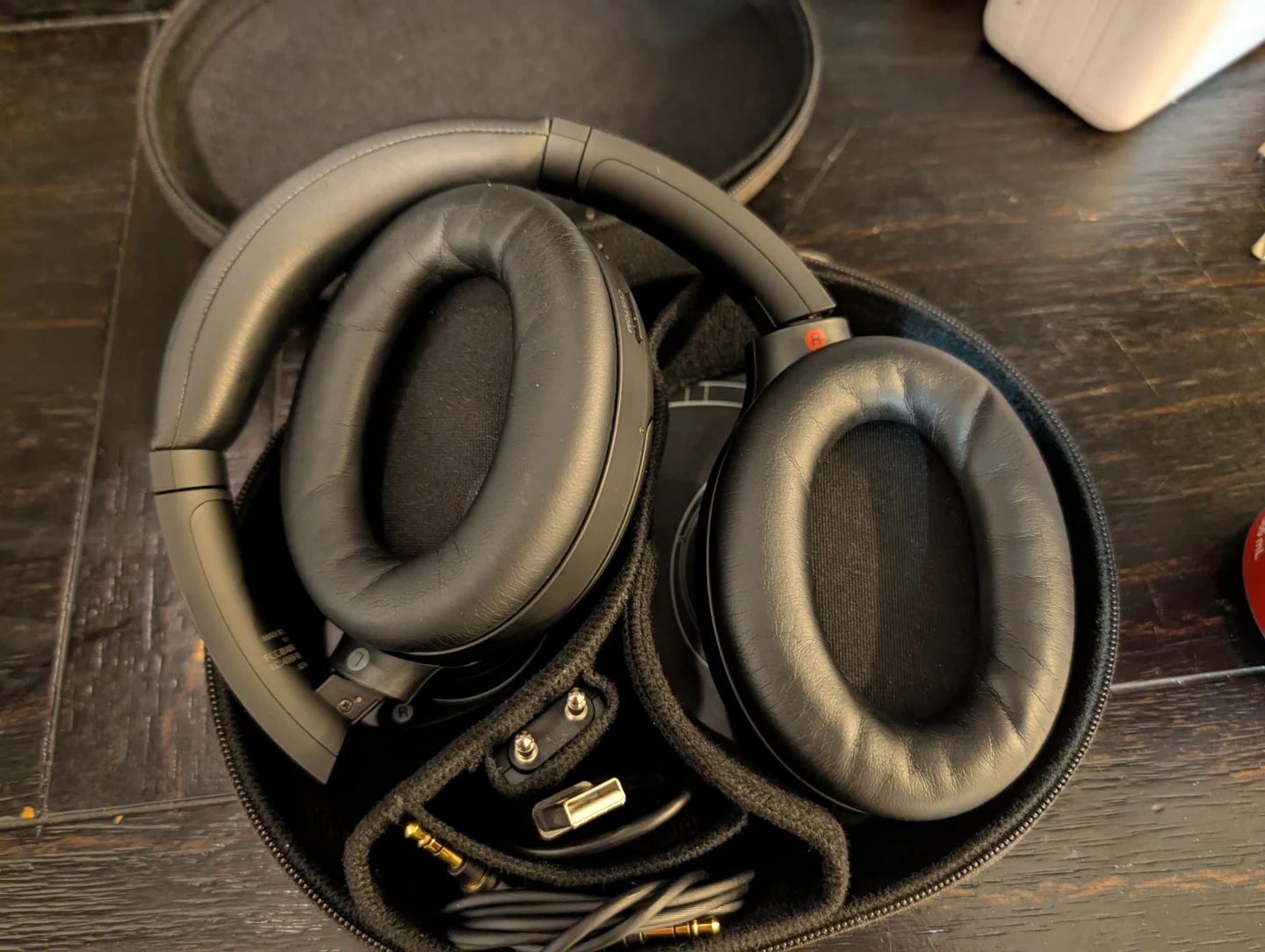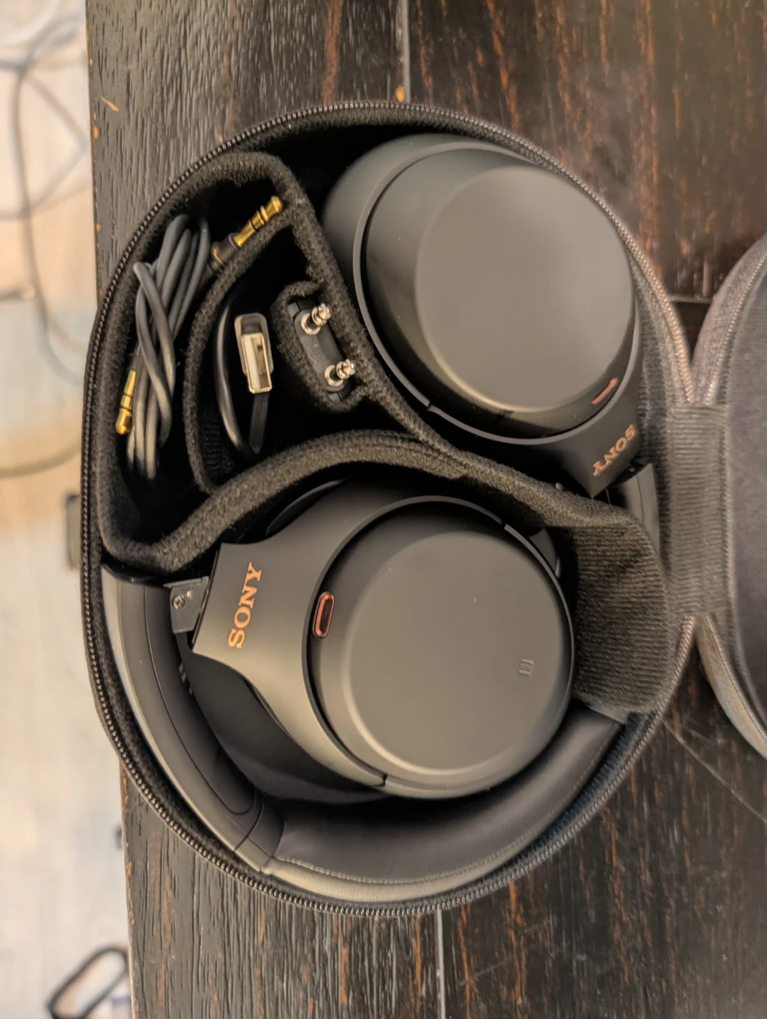 Sony WH-1000XM3 over-ear noise cancelling headphones in black. Includes carrying case, USB charging cable, audio cable, and airplane adapter. These are wireless Bluetooth headphones.