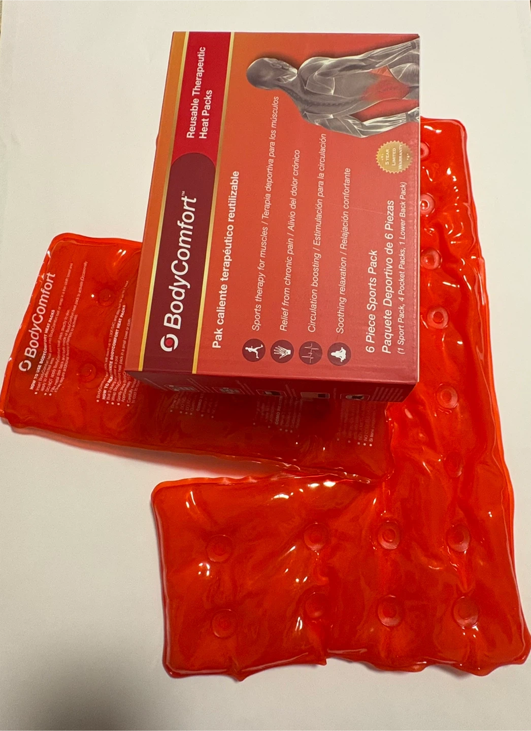 *This is a 6-piece sports pack of reusable therapeutic heat packs from BodyComfort. It's designed for sports therapy, relief from chronic pain, circulation boosting, and soothing relaxation. The pack includes 1 sport pack, 4 pocket packs, and 1 lower back pack. => this box is new, unopened.