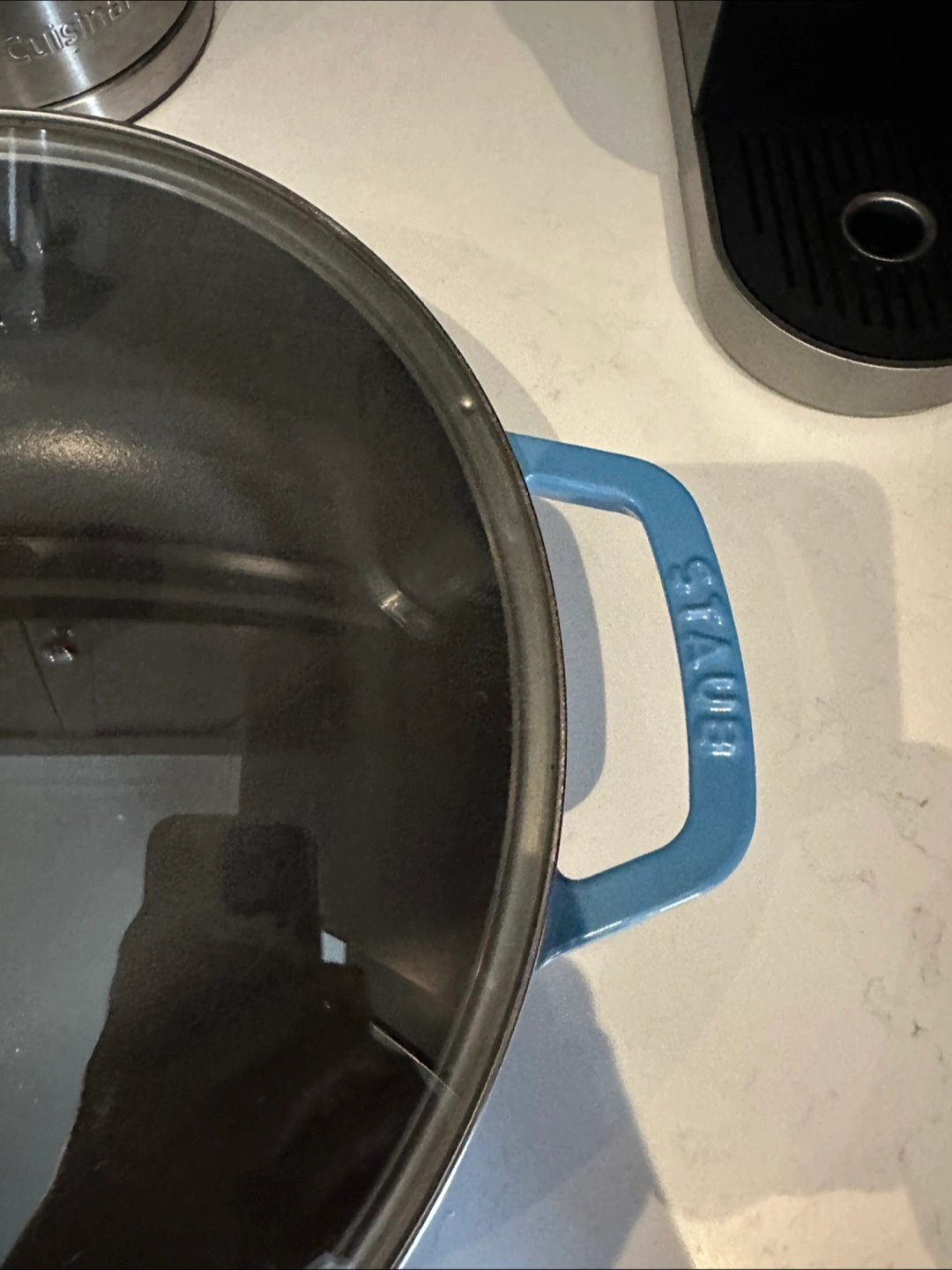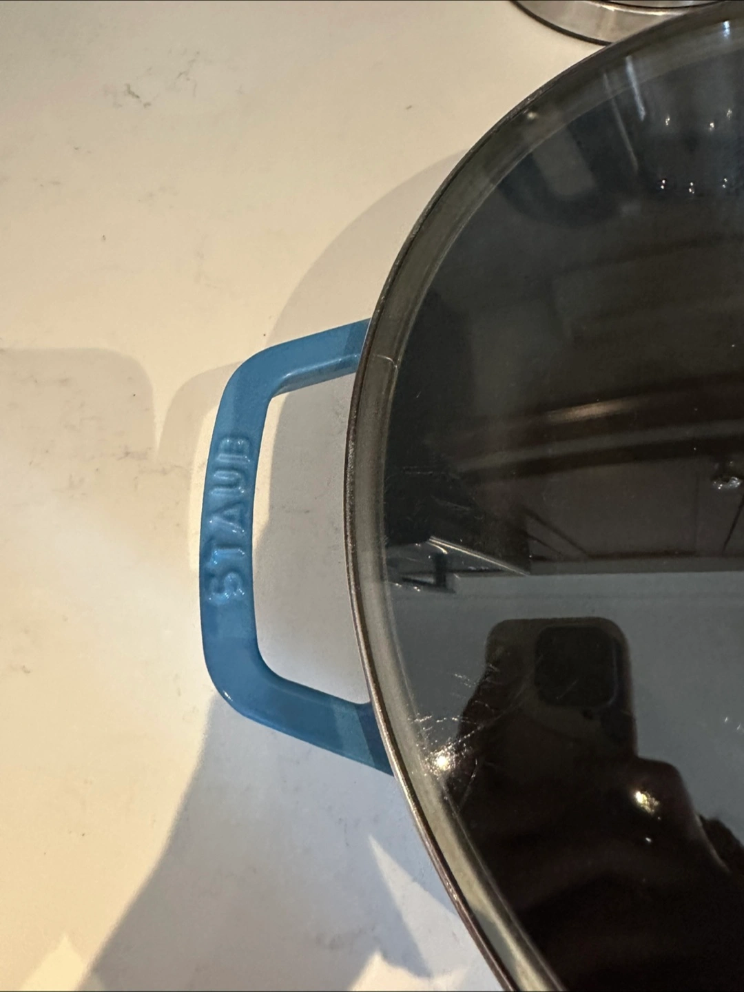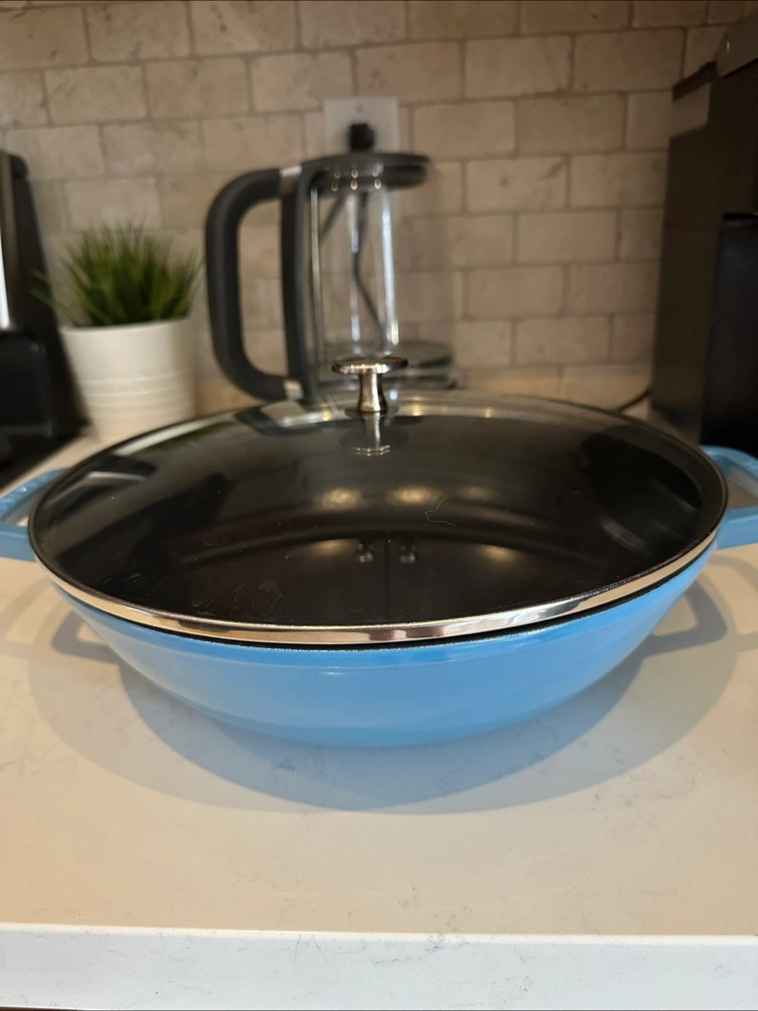 Selling a Staub cast iron wok, perfect for all your stir-fry needs! It's a beautiful blue colour and comes with a lid. The bottom says it's made in France, and the size is 30cm. This wok is super durable and great for even cooking