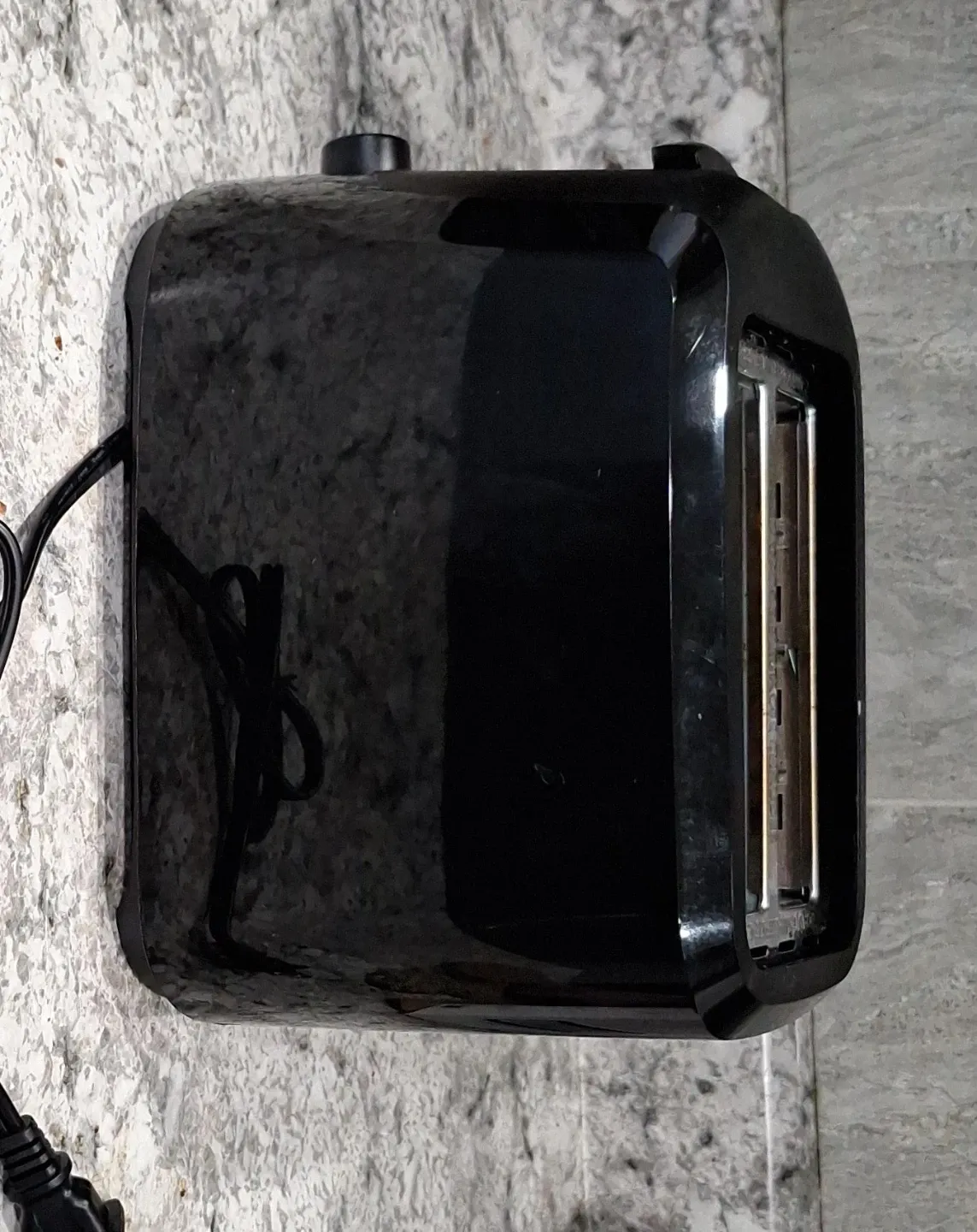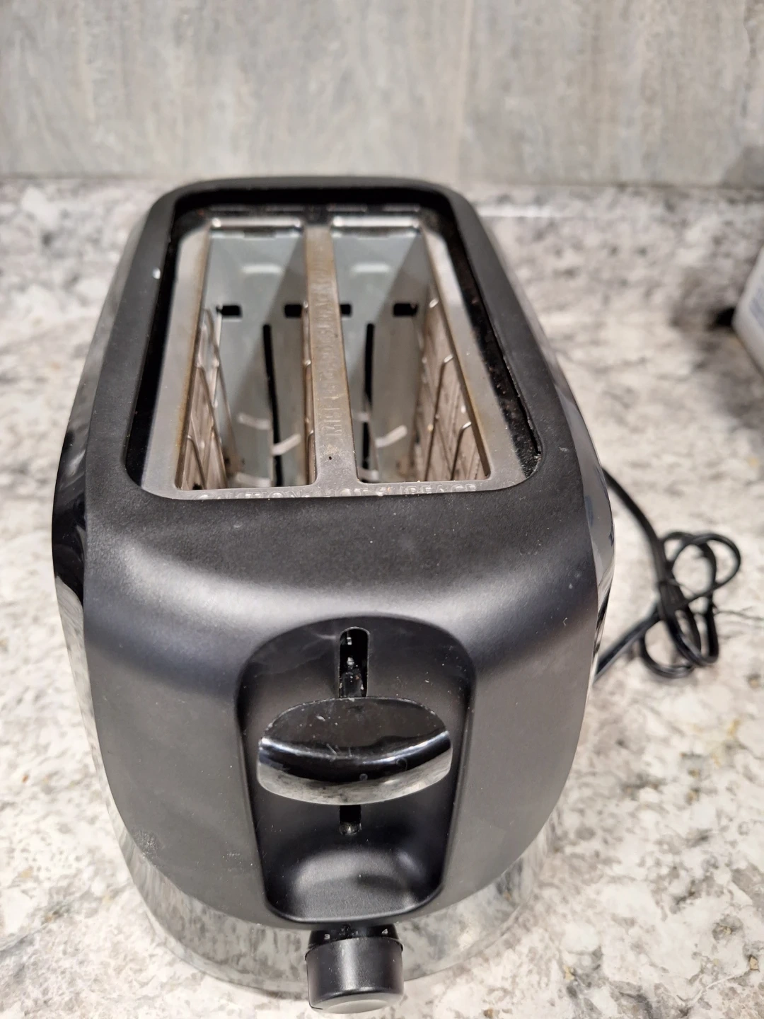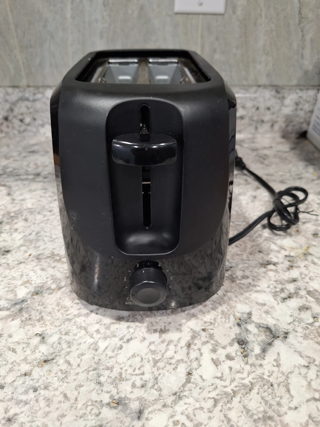 This is a black 2-slice toaster. It has a dial for browning settings and a lever to lower toast. Perfect for quick breakfast.