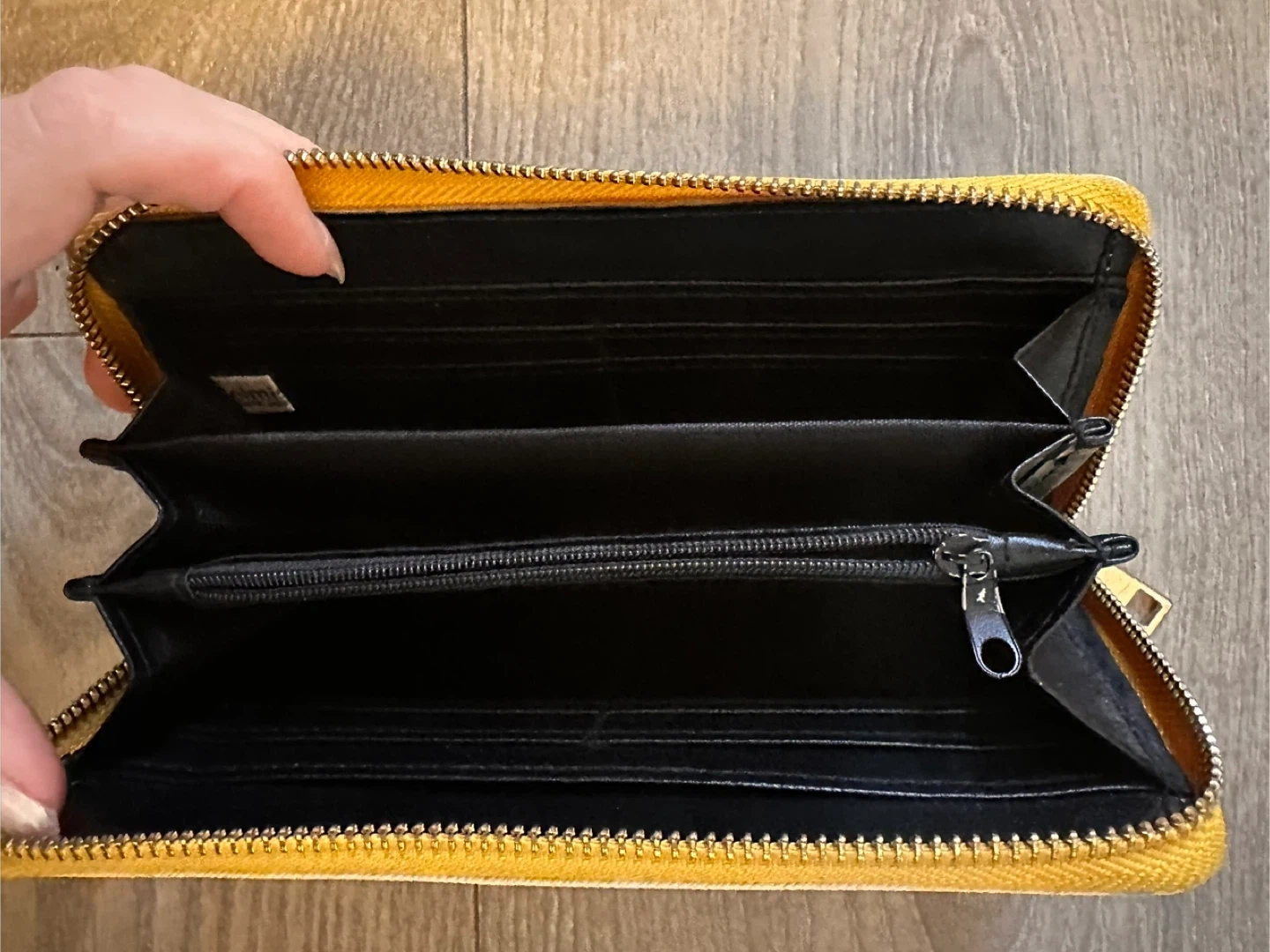This zip-around wallet features a fun yellow lemon print. It has multiple card slots and a zippered coin pocket inside. The exterior is a bright yellow with a white panel showcasing the lemon pattern.