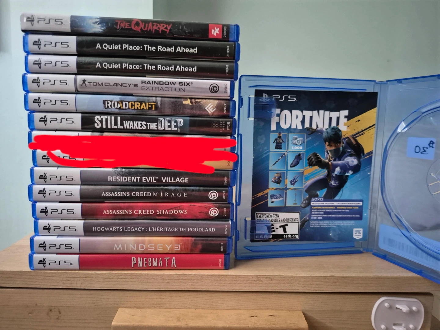 Collection of PS5 video games. Includes titles such as The Quarry, A Quiet Place, Rainbow Six Extraction, Roadcraft, Still Wakes the Deep, Death Stranding, Resident Evil Village, Assassins Creed Mirage, Assassins Creed Shadows, Hogwarts Legacy, Mindseye, and Pneumata. Also includes Fortnite with exclusive content.