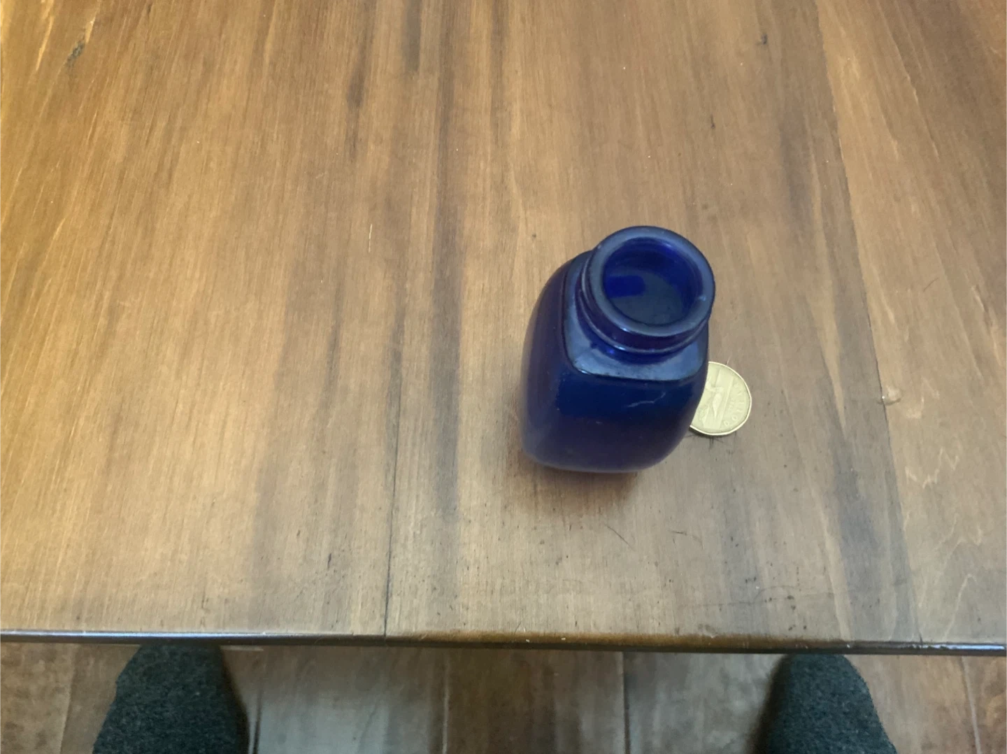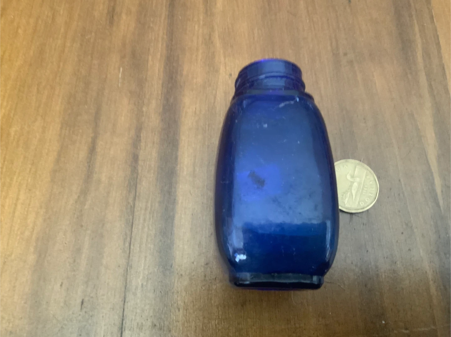 This is a small cobalt blue glass bottle. It's suitable for holding small quantities of liquid or for decorative purposes. The bottle has a screw-top opening.