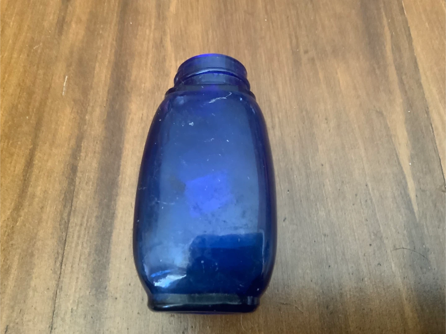 This is a small cobalt blue glass bottle. It's suitable for holding small quantities of liquid or for decorative purposes. The bottle has a screw-top opening.