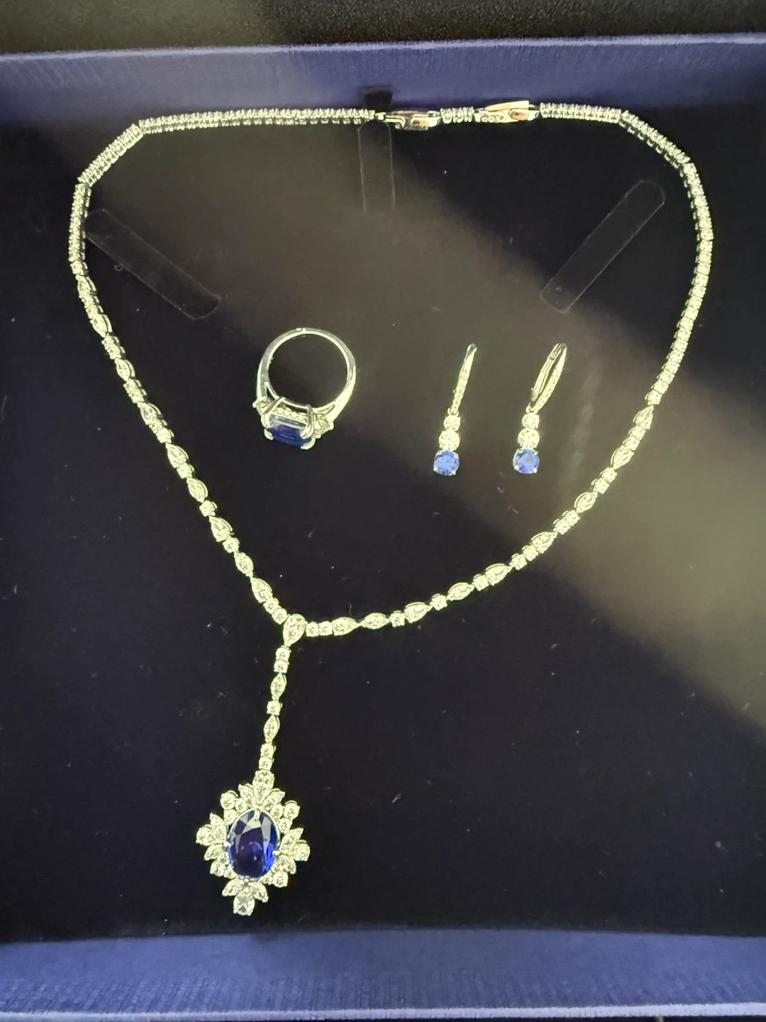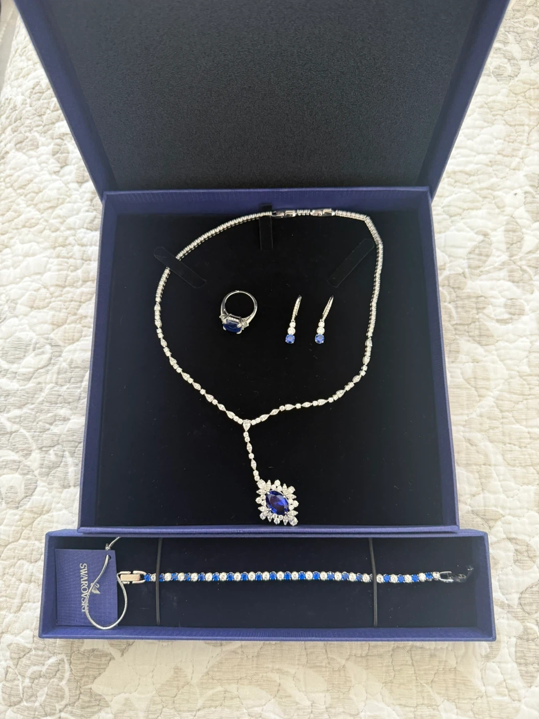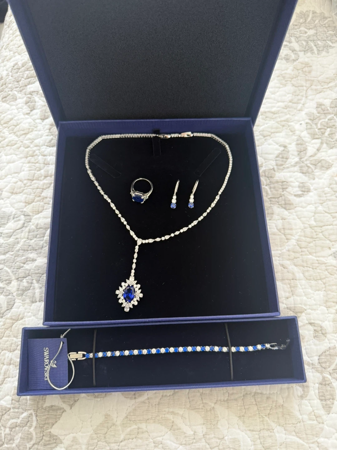 Stunning Swarovski crystal set featuring a necklace, a pair of earrings, a ring, and a matching bracelet. It's all presented in its original box for safekeeping. This set would be perfect for a special occasion! Selling full set for $200. Perfect for Valentine’s Day gift.