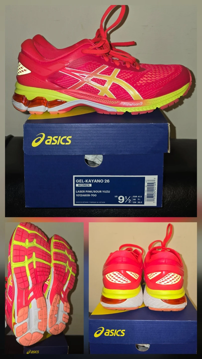 Selling a pair of Asics Gel-Kayano 26 women's running shoes in size 9.5 US. The color is Laser Pink/Sour Yuzu. Comes with the original box. Fits best 8.5 - 9