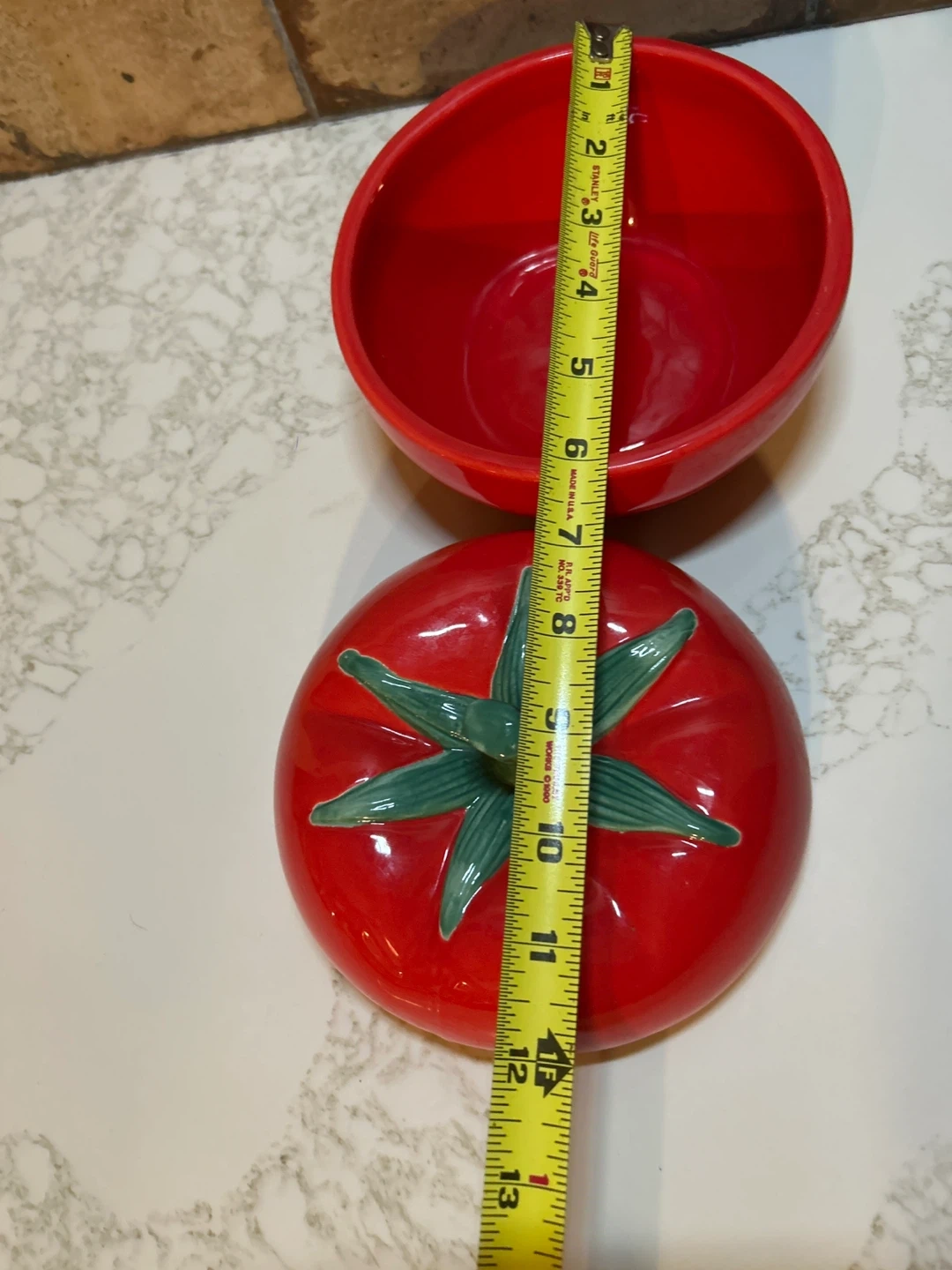 This fun ceramic dish is shaped like a bright red tomato! It's perfect for holding candy, trinkets, or small snacks. It stands about 5 inches tall. Great for your kitchen counter or as a quirky decor piece!