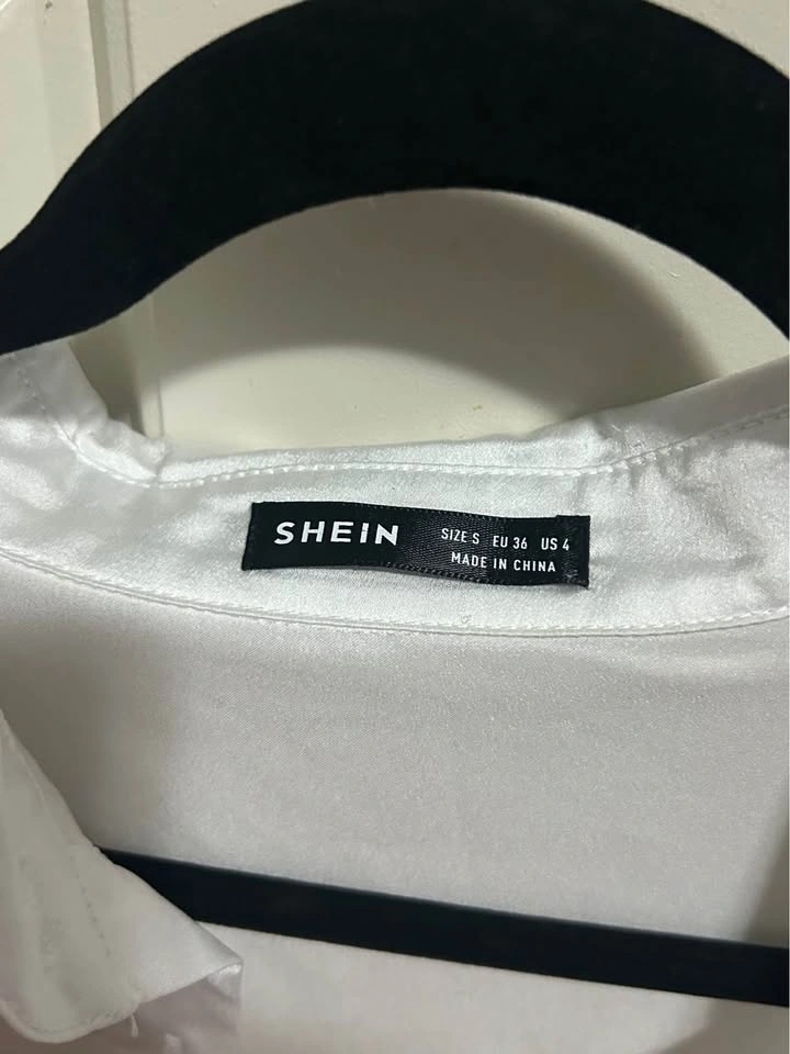 Shiny white long sleeve button up shirt. SHEIN brand. Size Small, US 4, EU 36. Satin-like material. Selling cause the size was not for me.