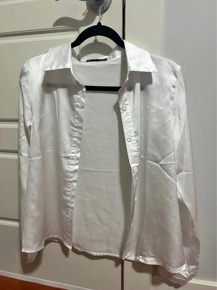 Shiny white long sleeve button up shirt. SHEIN brand. Size Small, US 4, EU 36. Satin-like material. Selling cause the size was not for me.