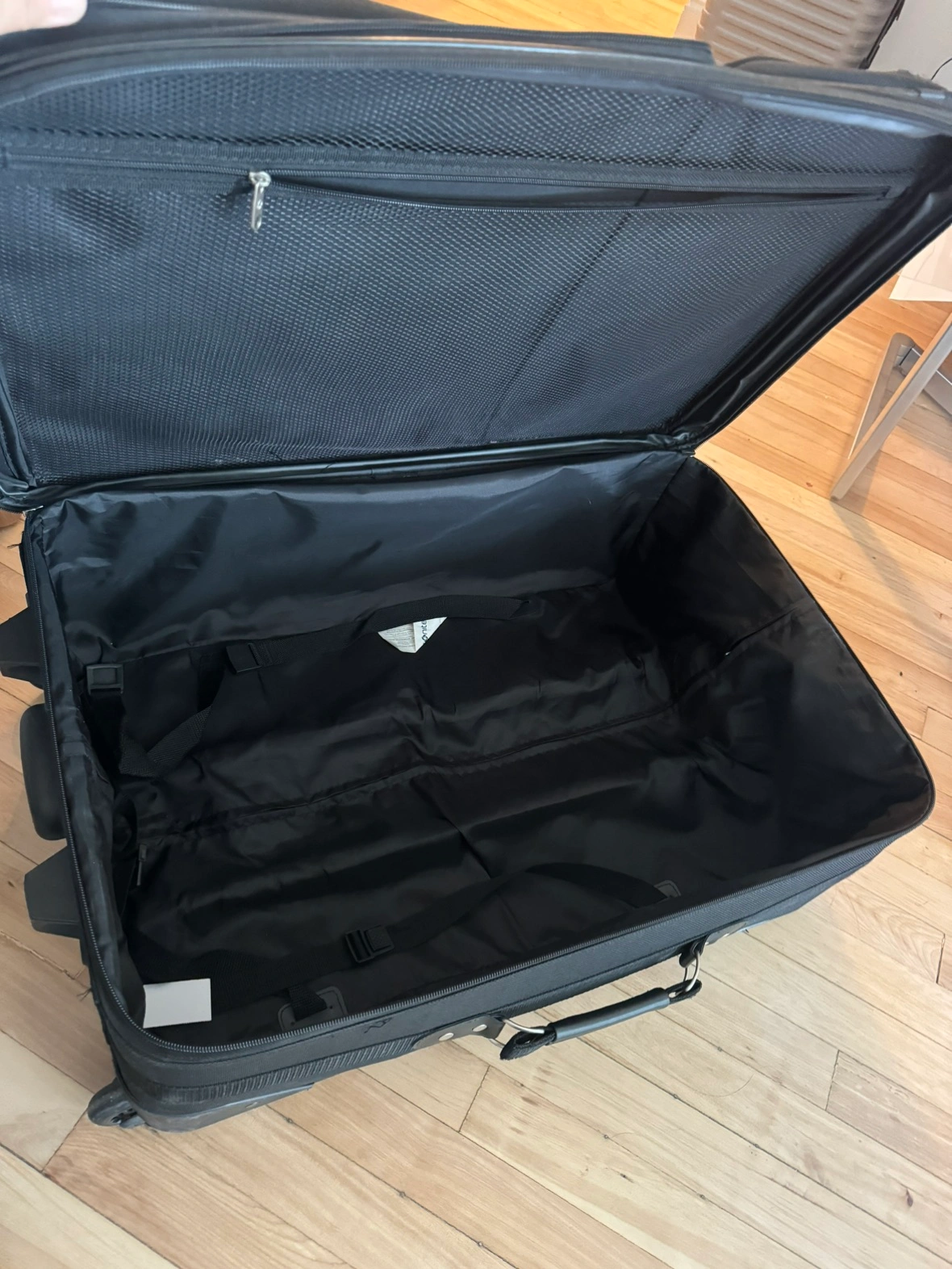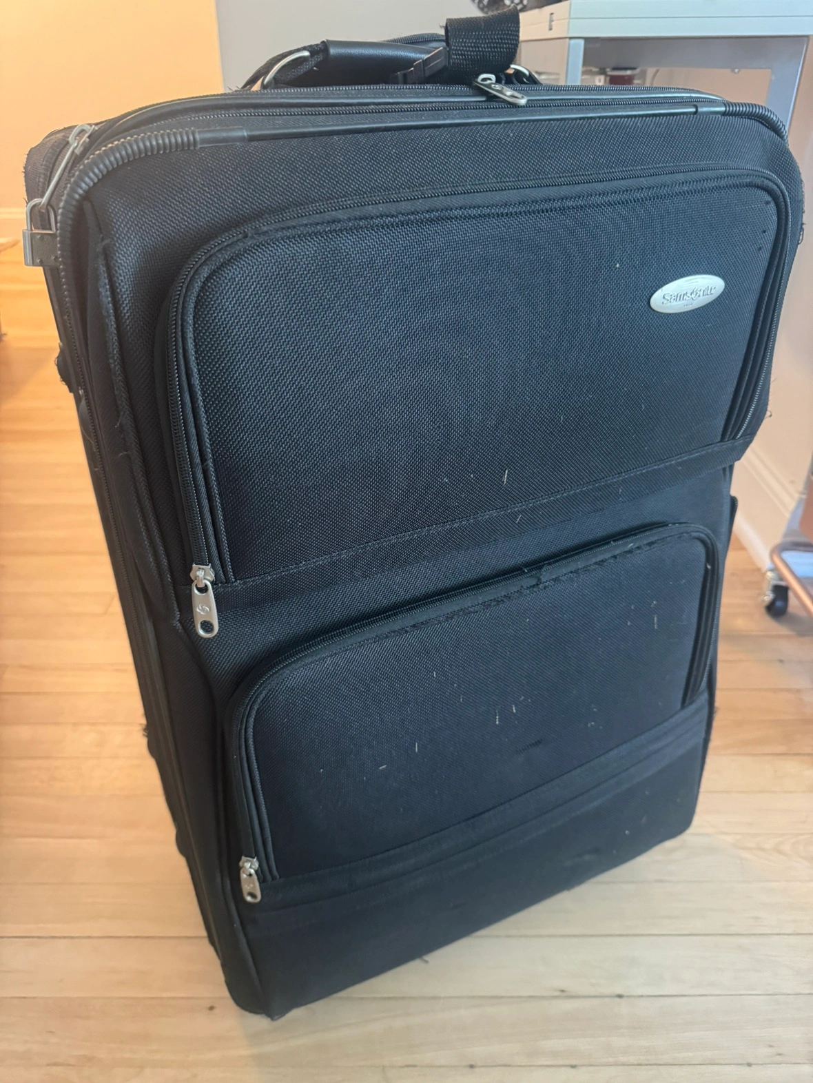 Samsonite black cloth luggage 28 inch. Big space inside and 2 zipper pockets outside. 2 wheel roller. In good condition!