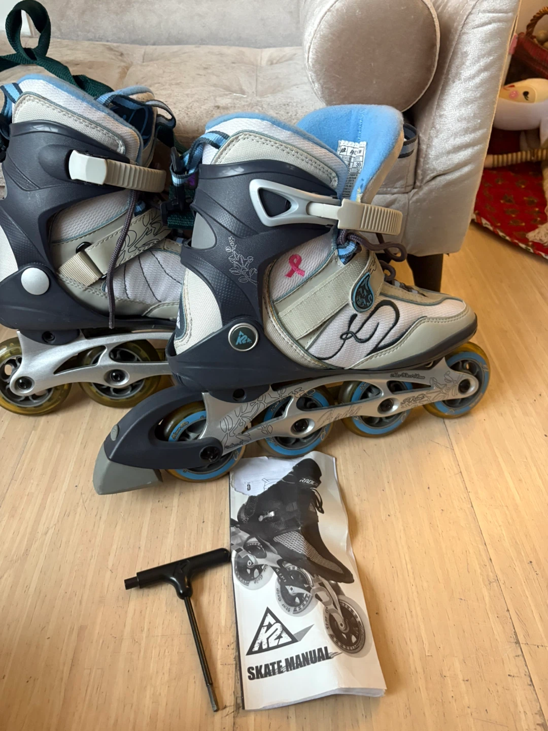 K2 Andfaw inline skates for women. Size US 8 (EUR 39, UK 5.5). They include the original skate manual and an adjustment tool. Great for recreational skating!