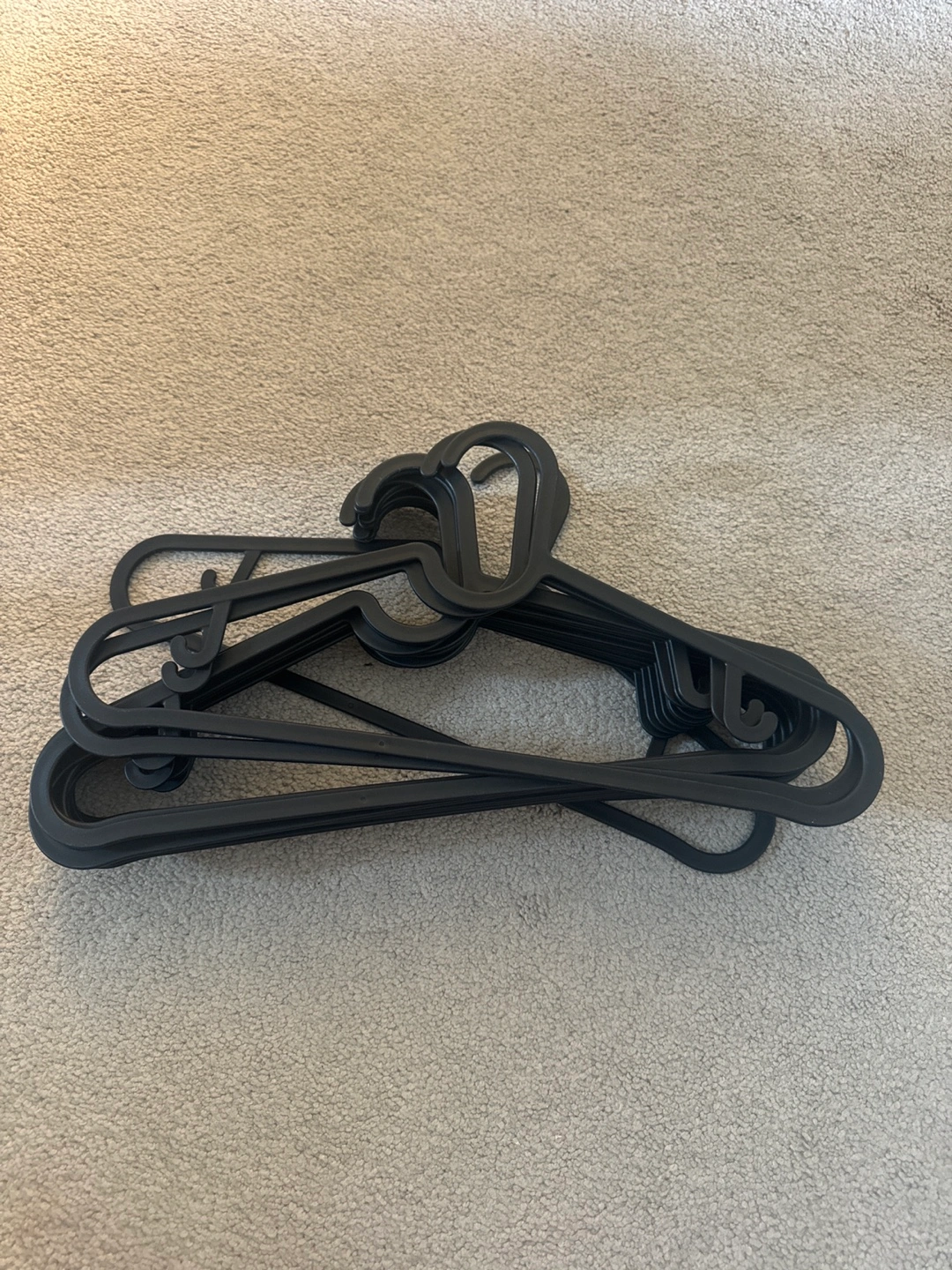 Ten black plastic clothes hangers. Good for closets or storage. Lightweight and durable.