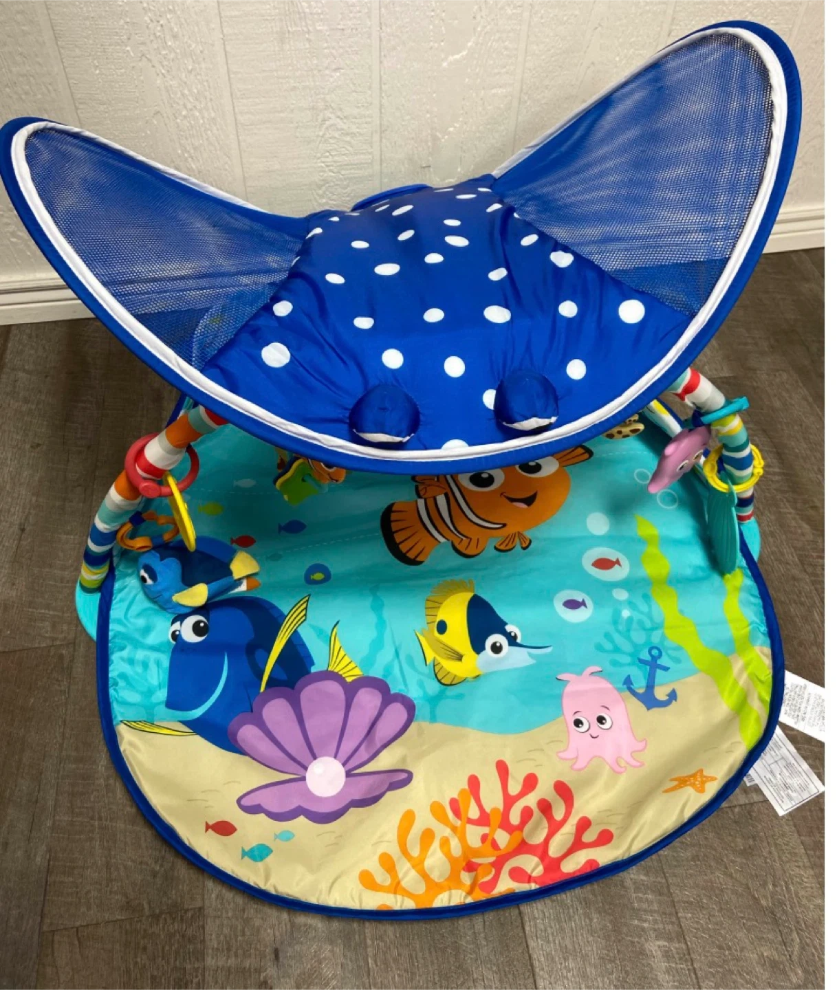 This play mat features characters from Disney's Finding Nemo, including Dory and Nemo. It's designed for tummy time and play. Includes several colourful hanging toys.