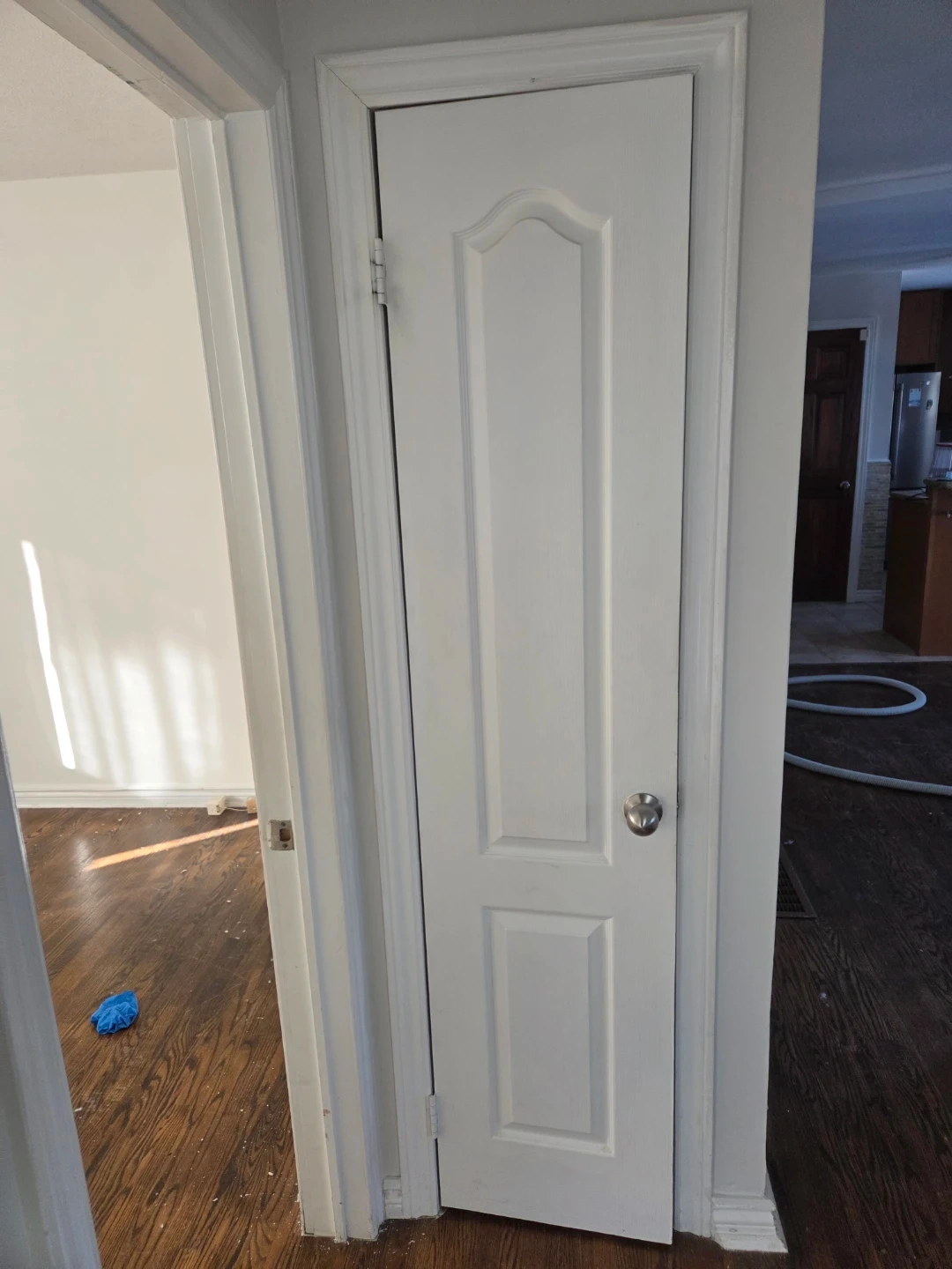 Standard white interior door with a silver knob. It's a panel door with a classic design. Suitable for any room in your home. Hinges are on the left side.