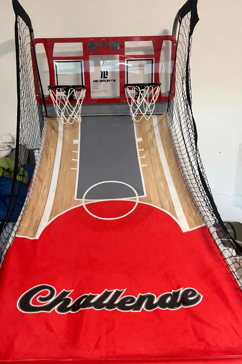This MD Sports basketball arcade game features a dual hoop design. It has a durable build with netting on the sides. It's great for indoor fun and practice!