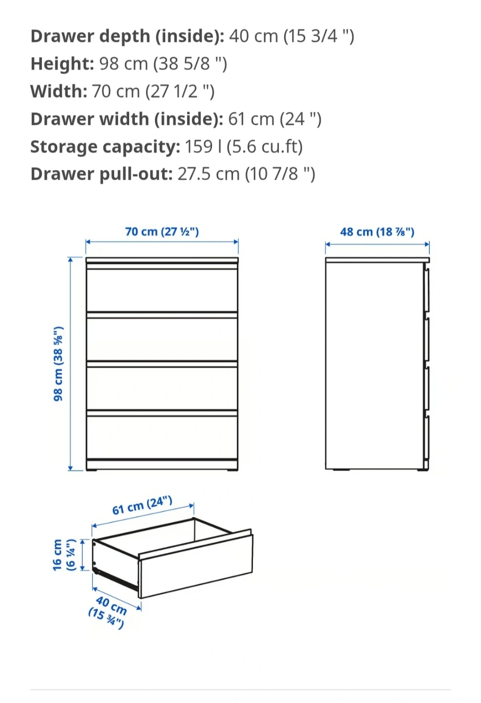 Buy & SellIKEA 4-Drawer Chest of DrawersIKEA 4-Drawer Chest of Drawers$120 Height: 98 cm (38 5/8 ") Width: 70 cm (27 1/2 ") Storage capacity: 159 l (5.6 cu.ft)ConditionLike newWHERE TO MEETN2L 0E6View MapSELLERAafreenLaurier00 reviews2 chats·2 favorites·11 viewsSEND CHAT TO SELLERHi Aafreen! I’m interested in your listing.Hi Aafreen! I’m interested in your listing.Get the Karrot app to chatSign In to chat