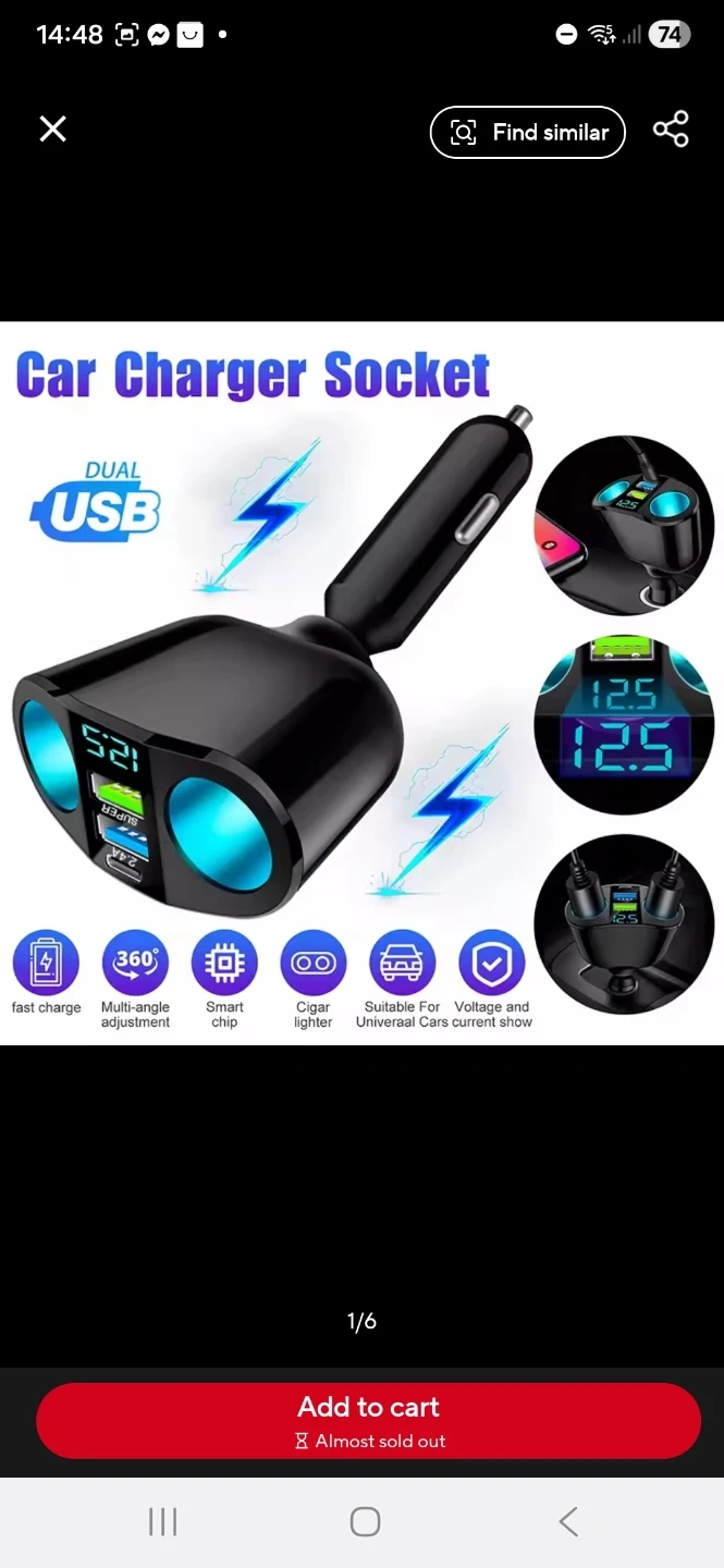 This car charger socket offers dual USB ports for charging devices. It features fast charging capabilities and a multi-angle adjustment for convenience. The built-in smart chip and voltage display provide essential information. It's suitable for universal cars and includes a cigar lighter function.