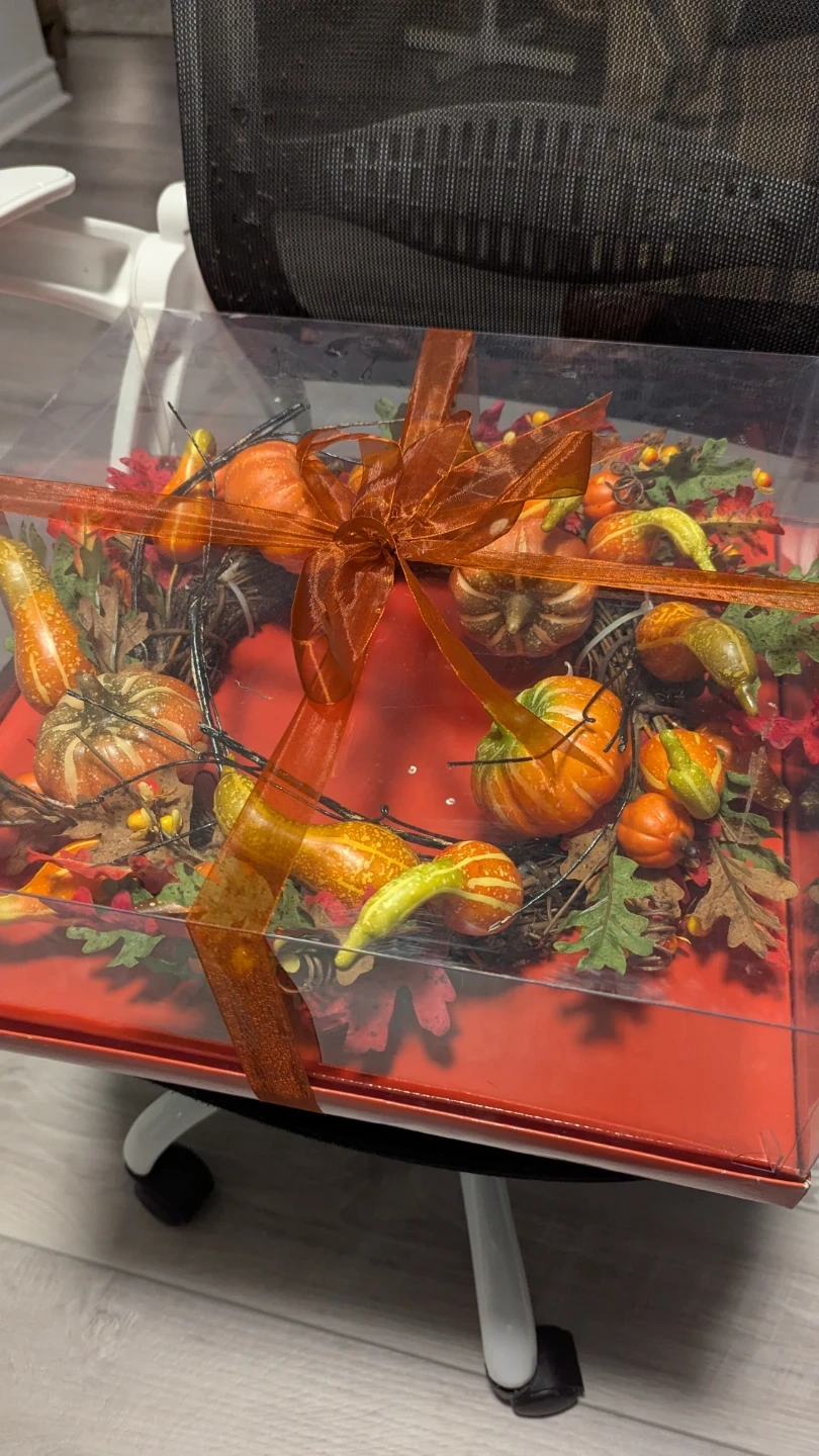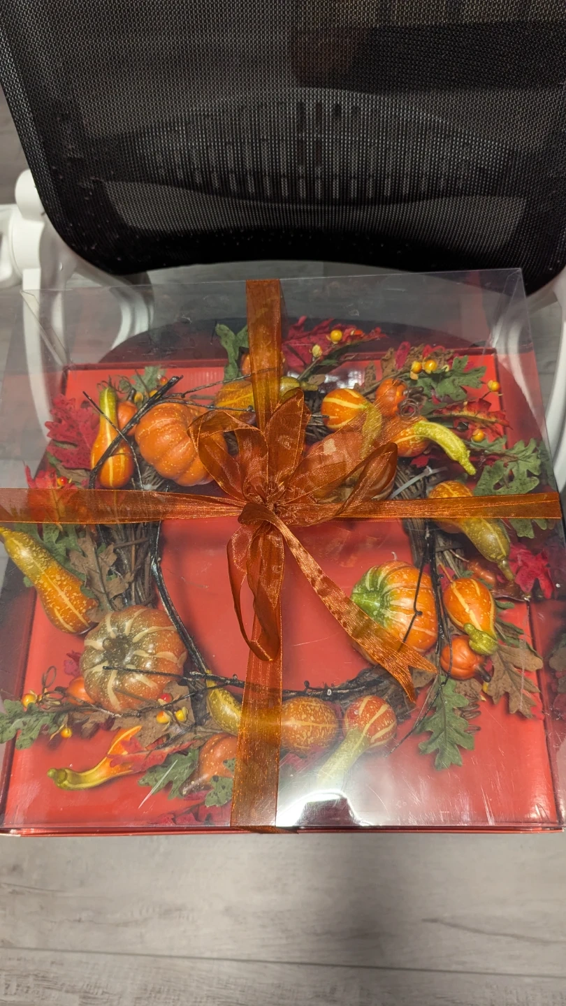 This decorative wreath features an assortment of pumpkins, gourds, and fall leaves. It's tied with a rustic ribbon and comes in a clear display box. Perfect for adding a festive touch to your home décor this autumn!