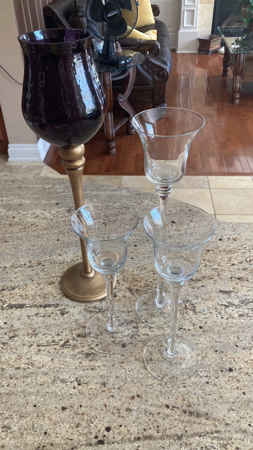 Selling four candle holders! One is a dark purple glass on a gold coloured stand, and the other three are clear glass