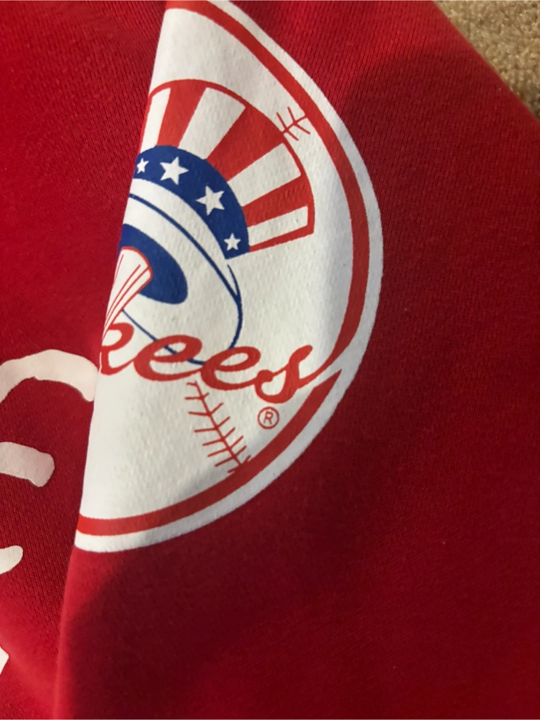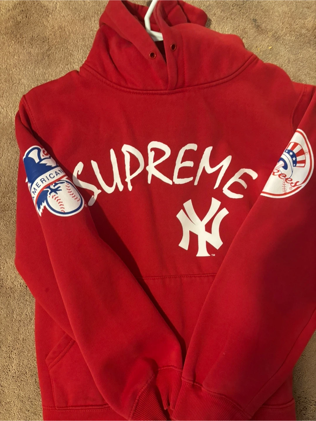 This red Supreme hoodie features a New York Yankees logo on the chest and sleeve patches. It's made of comfortable material, perfect for casual wear. It's a statement piece for any fan! Size Xs/s men’s