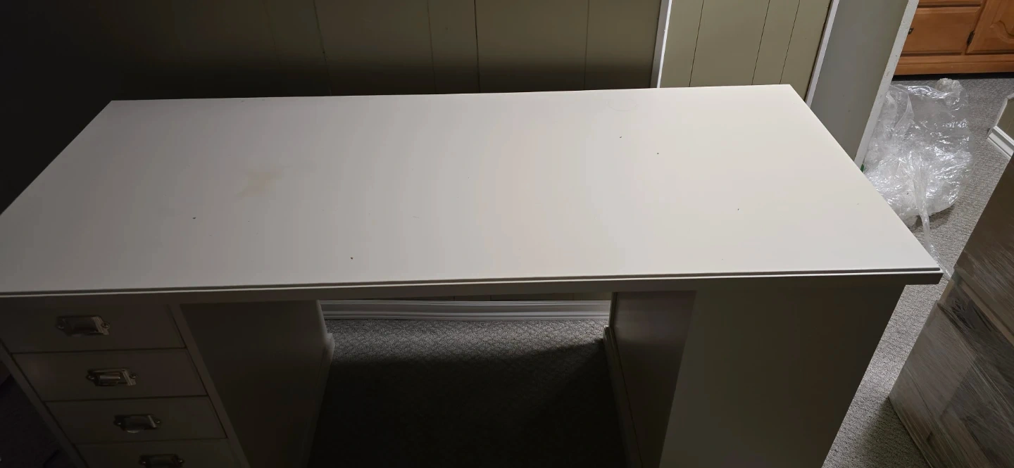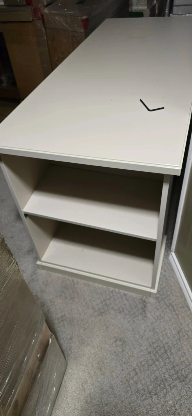 This white executive desk offers ample workspace and storage. It features a set of four drawers on one side and open shelving on the other. The neutral colour makes it versatile for any office or home setup. Perfect for organizing your work essentials and keeping your space tidy!