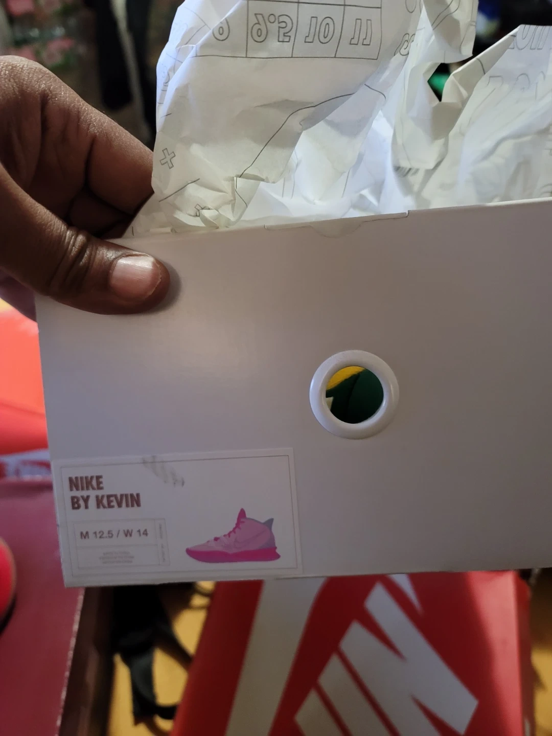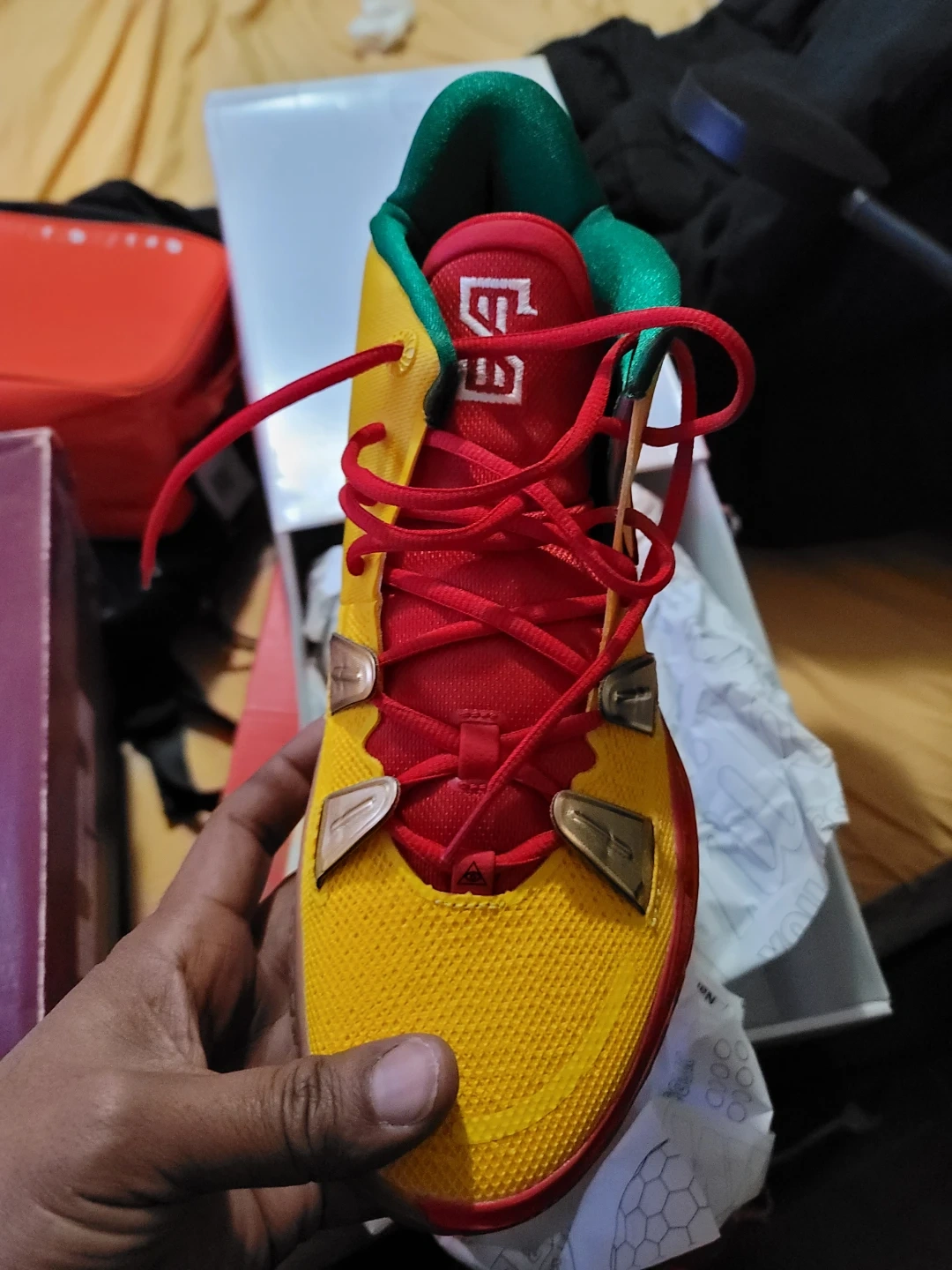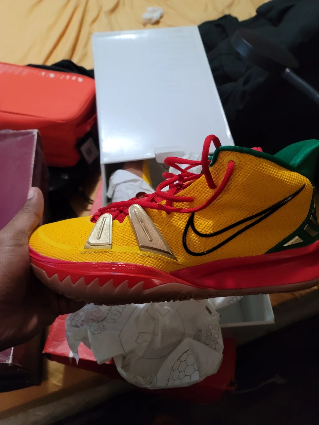 Yellow and red Nike Kyrie 7 basketball shoes with green accents. Includes original box. Size M 12.5 / W 14.