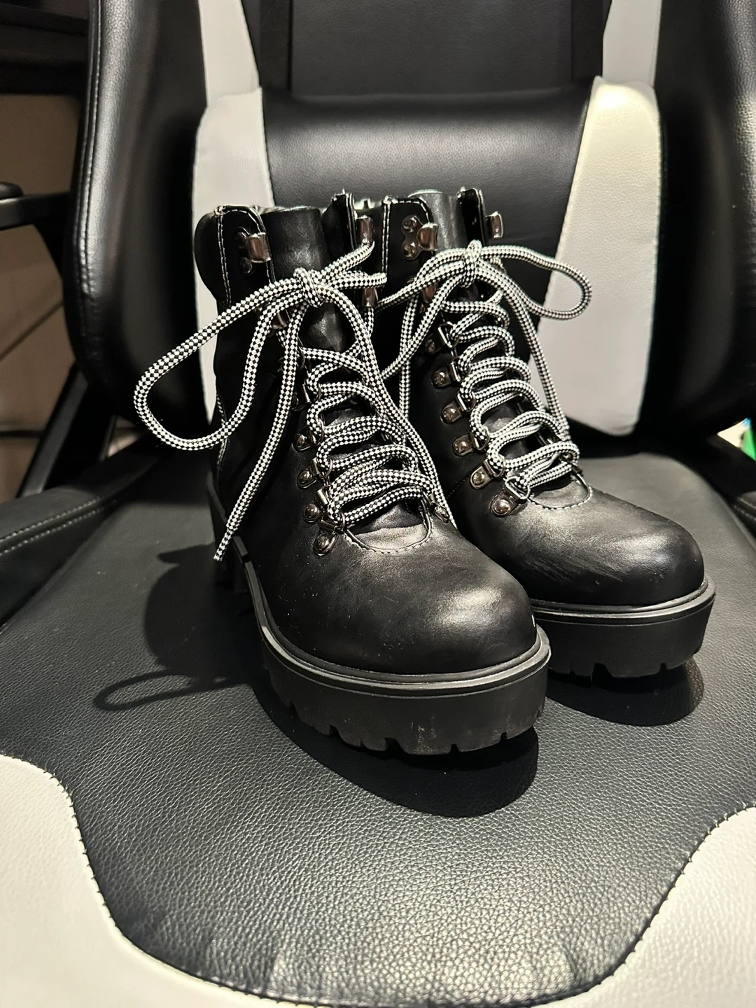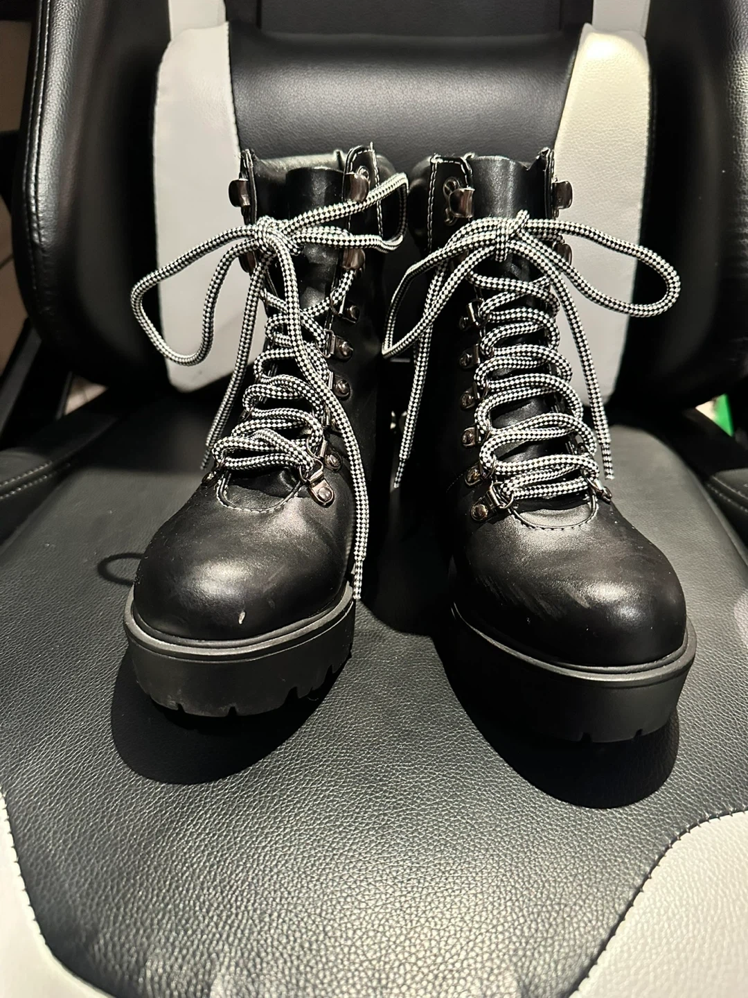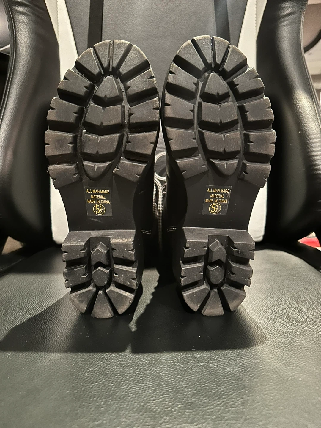 Selling a pair of black ankle boots in size 5.5. They have a lug sole and lace-up design. Perfect for adding a bit of edge to your outfit!