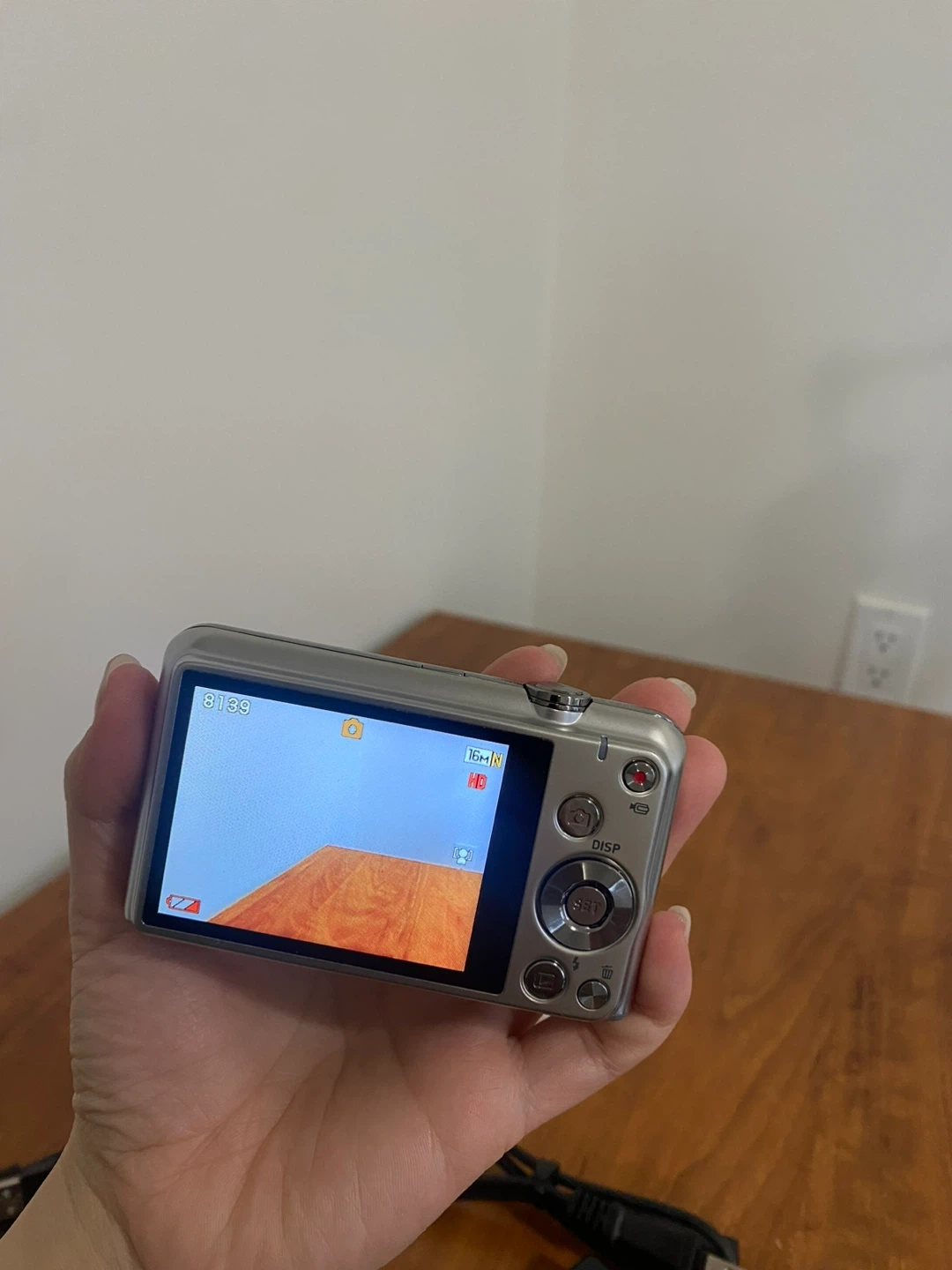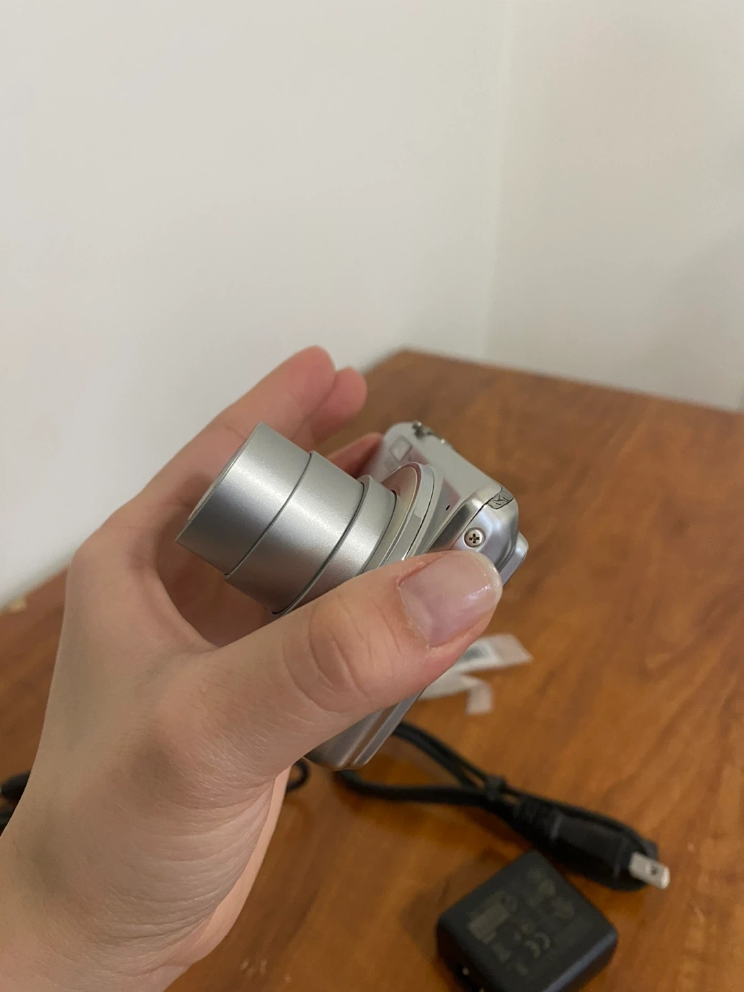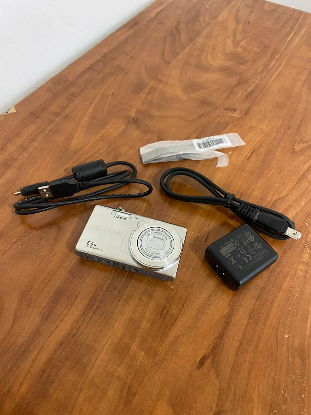 This is a silver Casio EXILIM digital camera with 6x optical zoom. It comes with a USB cable, charger, and a wrist strap. It's a compact camera perfect for everyday shots