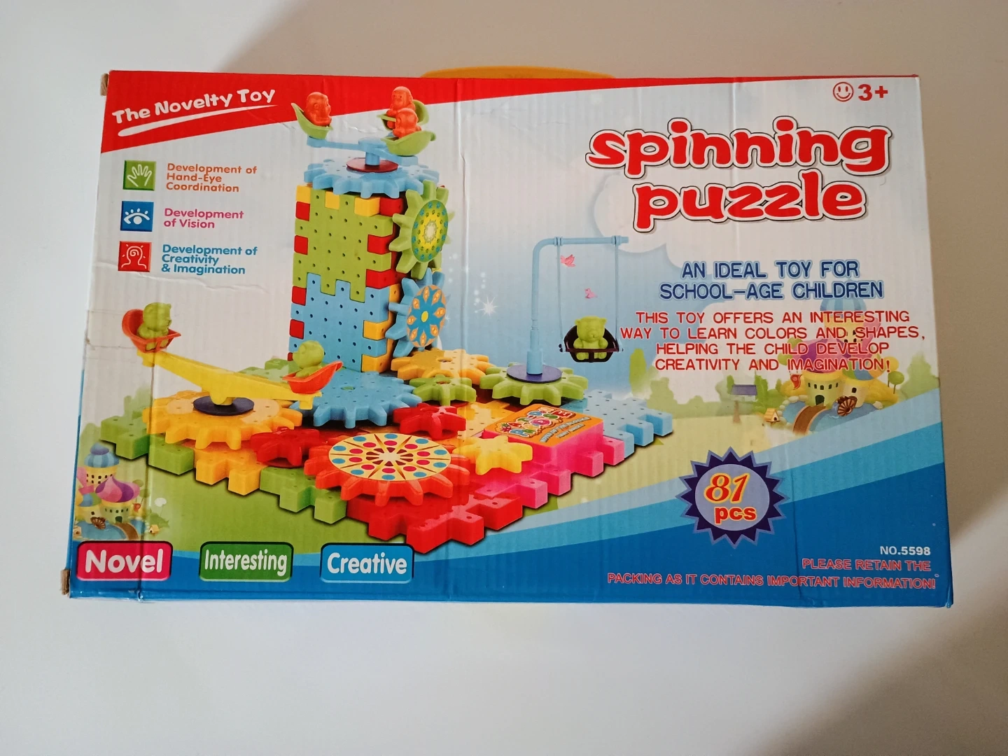 spinning puzzle toy. It's designed to help children develop hand-eye coordination, vision, creativity, and imagination. The toy teaches colors and shapes.