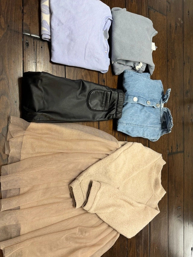 This is a cute and stylish Zara girls' clothing lot, size 4, featuring a variety of pieces for versatile outfits. The lot includes cozy sweaters, a denim shirt, faux leather leggings, a trendy plaid shacket, a fun dress and a cute matching top and bottom set. These pieces are in used condition, showing gentle wear but with lots of life left, perfect for mixing and matching to create adorable looks for your little one. Here are the included items: Denim shirt, Faux Leather Leggings, Plaid Shacket, Dress, Top and bottom sets. Cash accepted.
