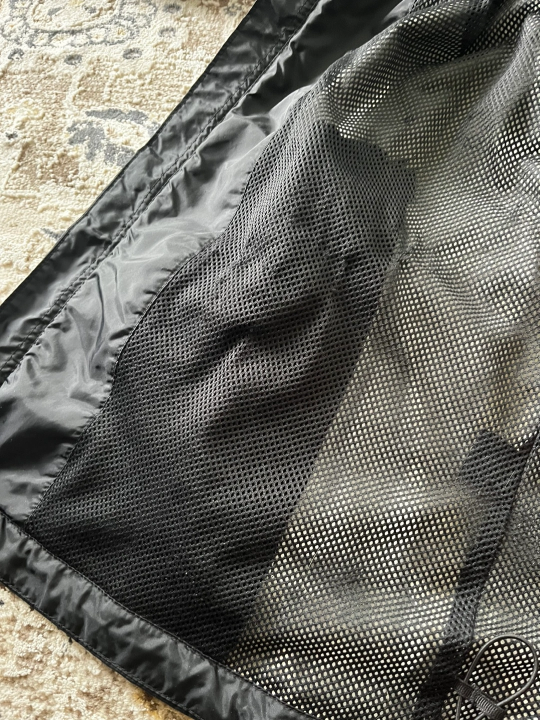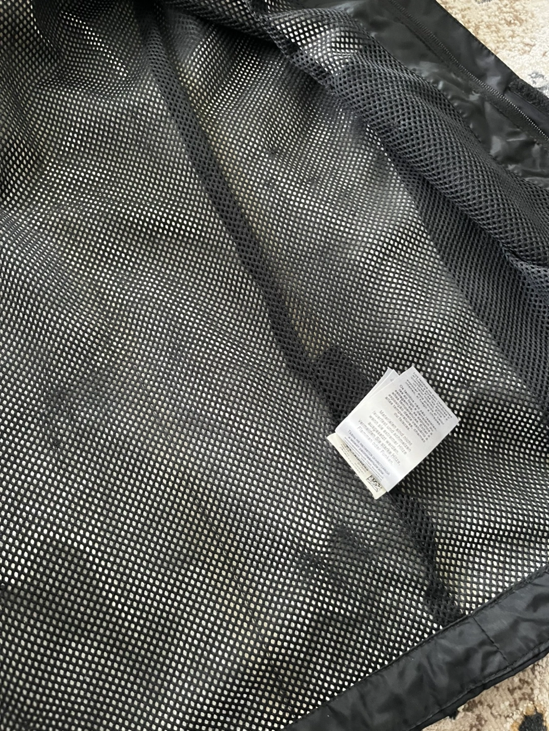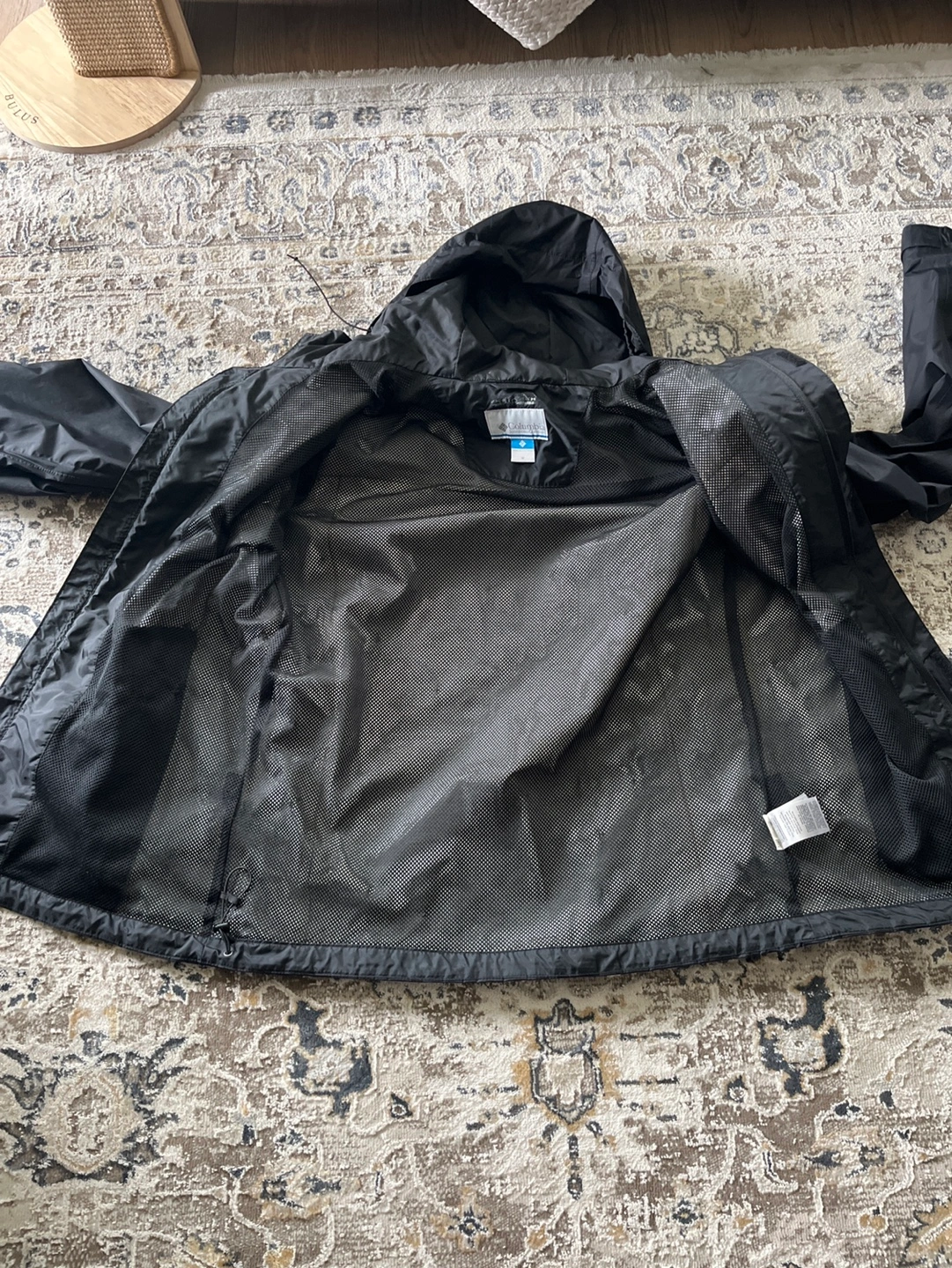Men's black rain jacket. Medium size. Features a hood and zip closure. Long sleeves. Great for rainy weather.