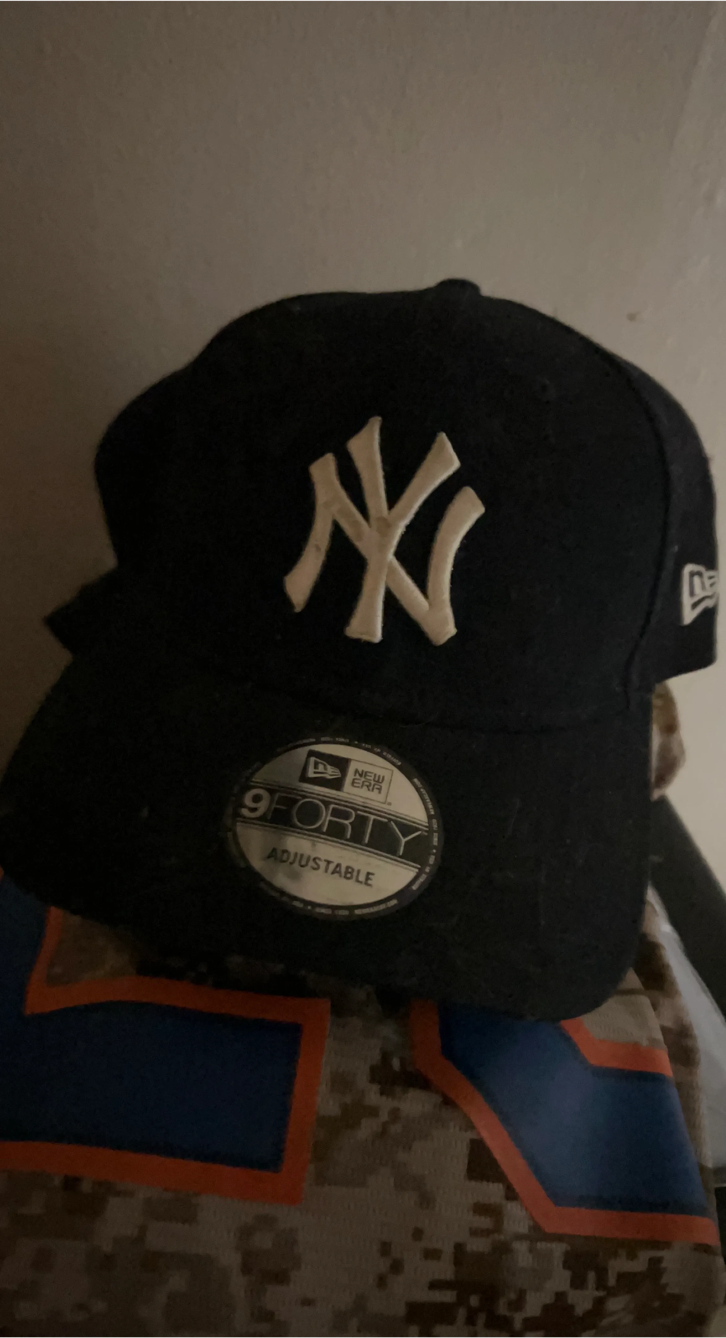 This is a New Era 9FORTY adjustable hat featuring the New York Yankees logo. It's a classic baseball cap design. One size fits most thanks to the adjustable strap.