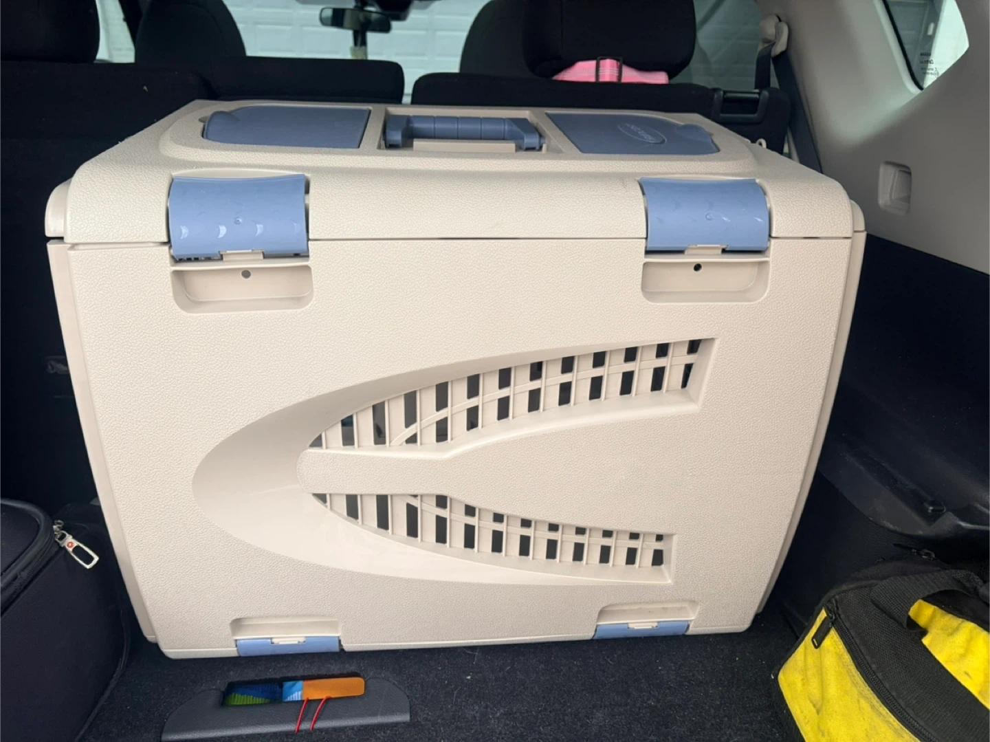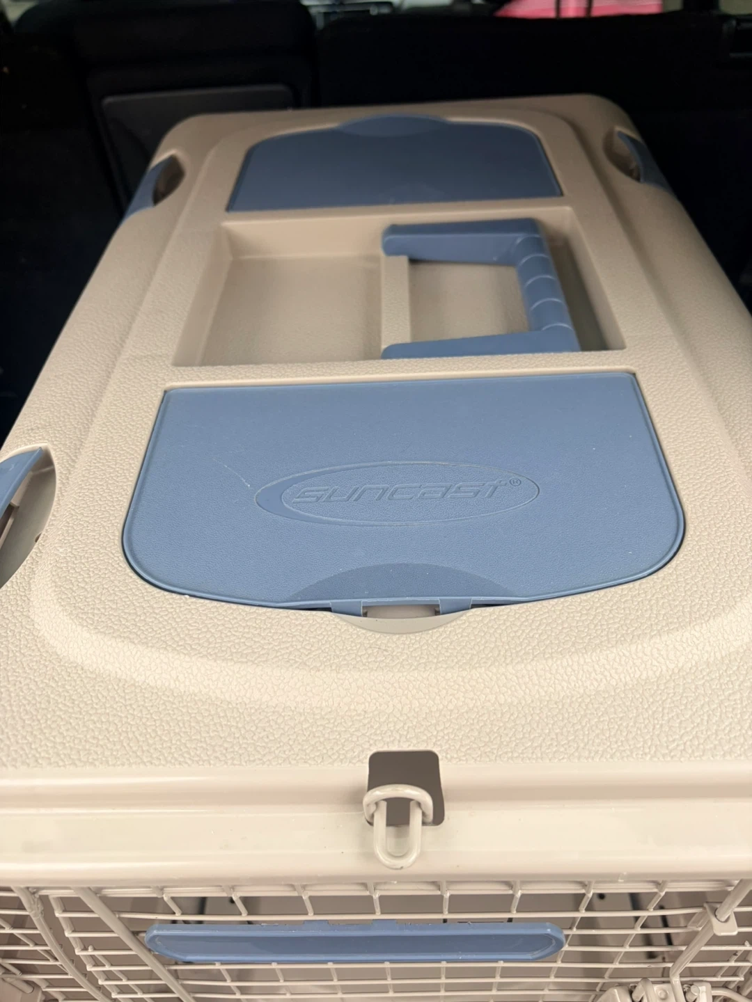 Durable beige and blue plastic pet carrier. Features a secure latching door and ventilation on the sides. It's great for travelling with your furry friend! Medium size