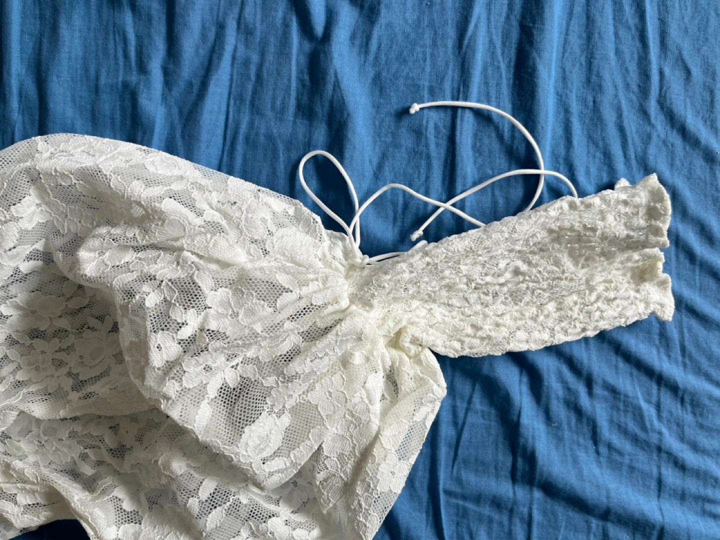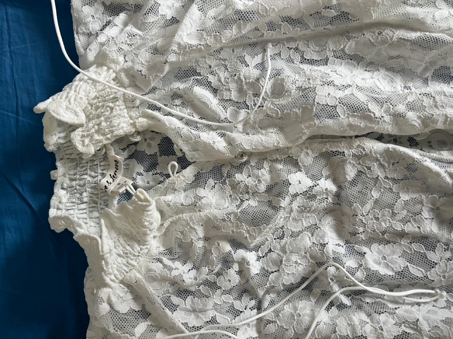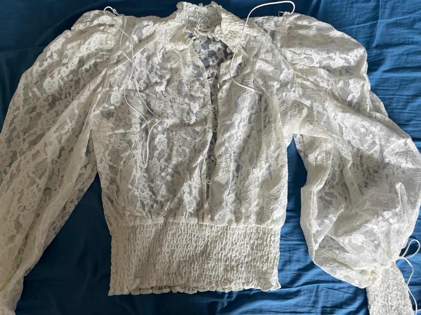 Beautiful white lace blouse. Can also be worn as a lingerie. Features puff sleeves, a fitted bodice, and a high neck. Long sleeves with ties at the cuffs. Lace-up detail at the front.